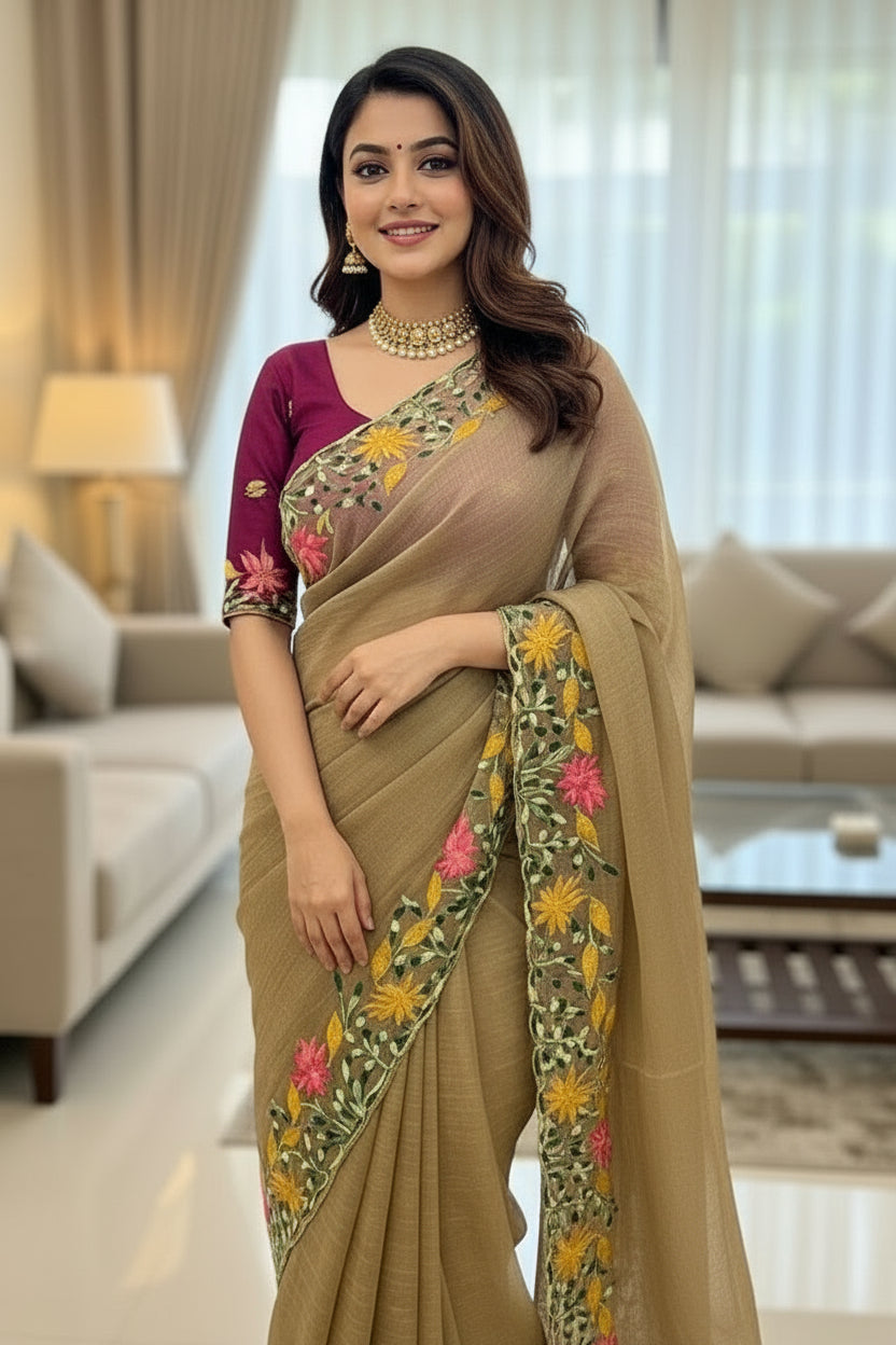 Discover the elegant and intricate design of our fancy Silk Saree Collection. Featuring beautiful embroidery work , this fabric exudes sophistication. The impeccable craftsmanship and unique charm of the saree make it a stunning addition to any wardrobe, perfect for making a bold fashion statement while honoring traditional customs.