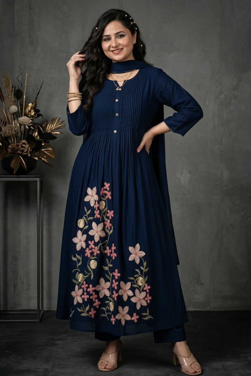 Introducing our soft Cotton Kurti Set—a timeless classic for versatile elegance. This stunning three-piece set features rich embroidery, a designer neckline, and beautifully detailed yoke area in A-line silhouette, paired with matching pants and a Mul Cotton dupatta. Crafted from premium cotton (60*60), this set is breathable, lightweight, and non-transparent—perfect for staying cool and stylish.
