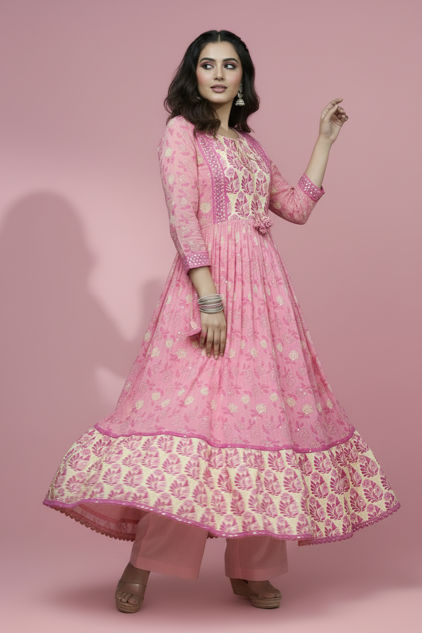 The displayed model image is AI-generated to demonstrate the kurtis set drape and elegance. Actual product color and details may vary slightly. Please review the original product images for precise representation.