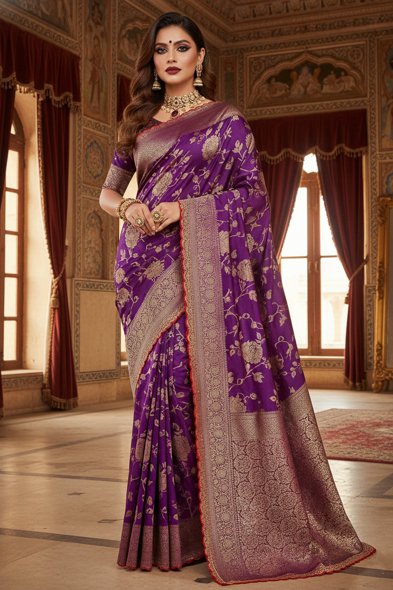• The saree also comes with a designer Contrast Brocade Blouse Piece