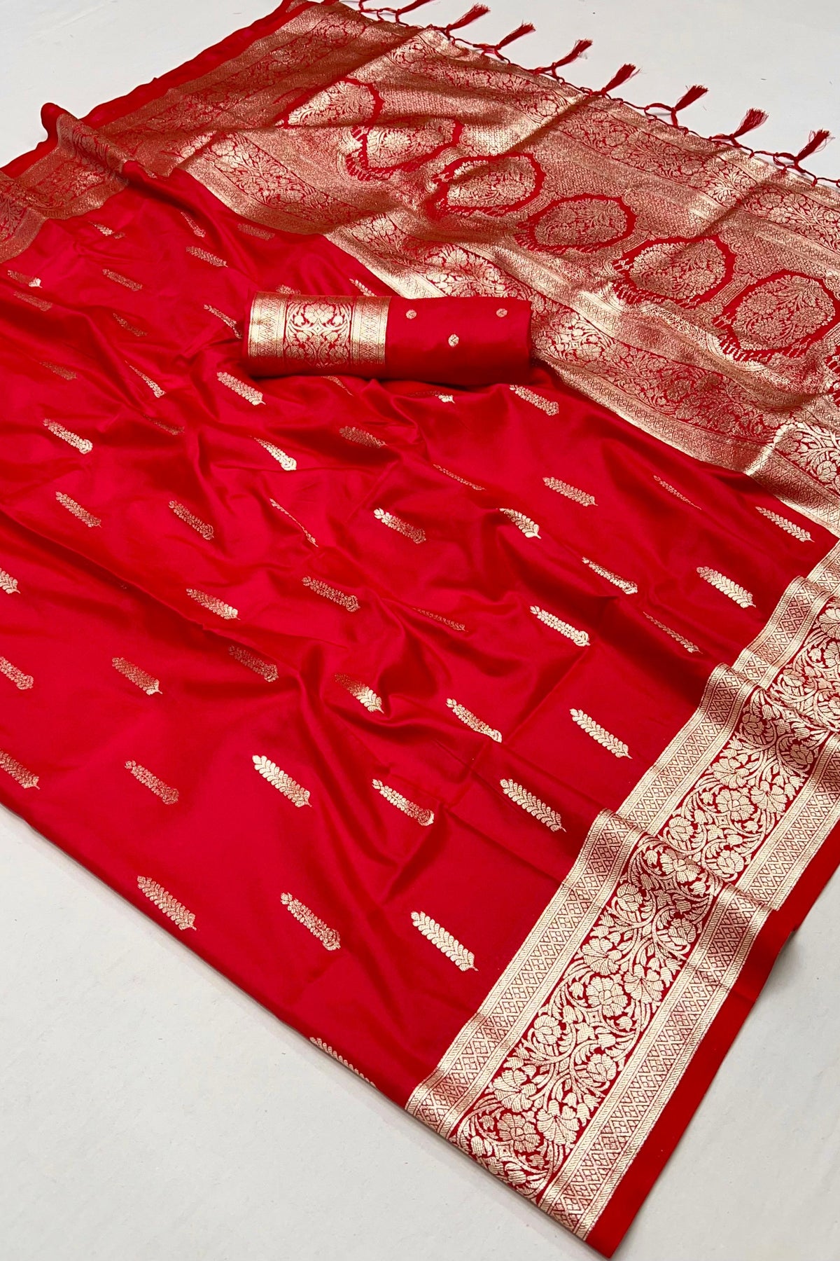 This exquisite Banarasi Silk Saree showcases silk (semi) material and zari weaving with meenakari work all over, highlighted by stunning weaving. The luxurious and refined beautiful weaving extends to the border. The saree is complemented with traditional designs. Elevate your fashion game with this premium and classic saree.