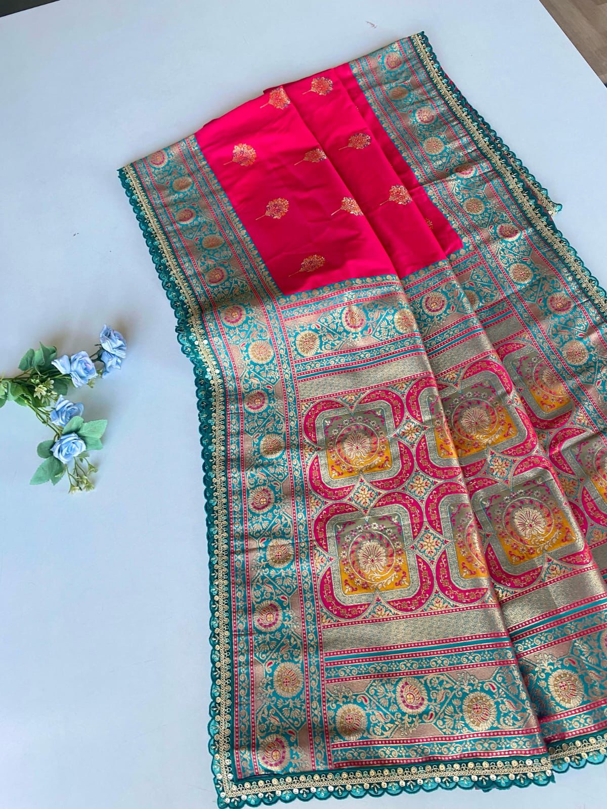 This exquisite Banarasi Silk Saree showcases Banarasi silk saree (semi) material and intricate thread weaving all over, highlighted by rich weaving pallu . The luxurious and refined weaving extends to the body. The saree is complemented with traditional designs. Elevate your fashion game with this premium and classic saree.