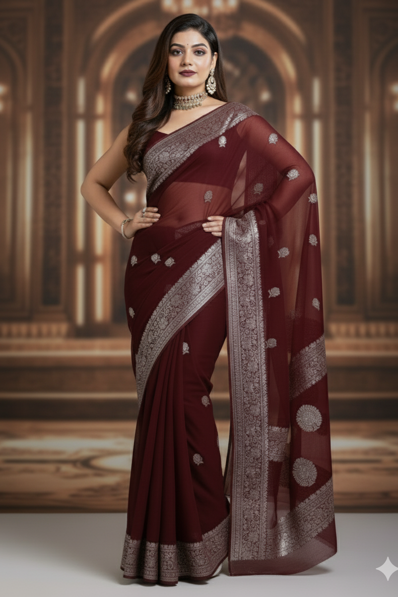 Legacy Of Khaddi Chiffon Handloom Banarasi Saree(Wine)