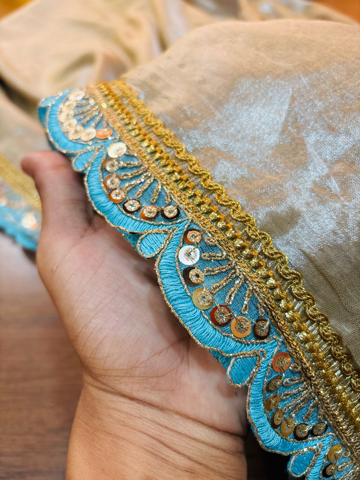 - Border has designer scalloped style cutwork with sequins work