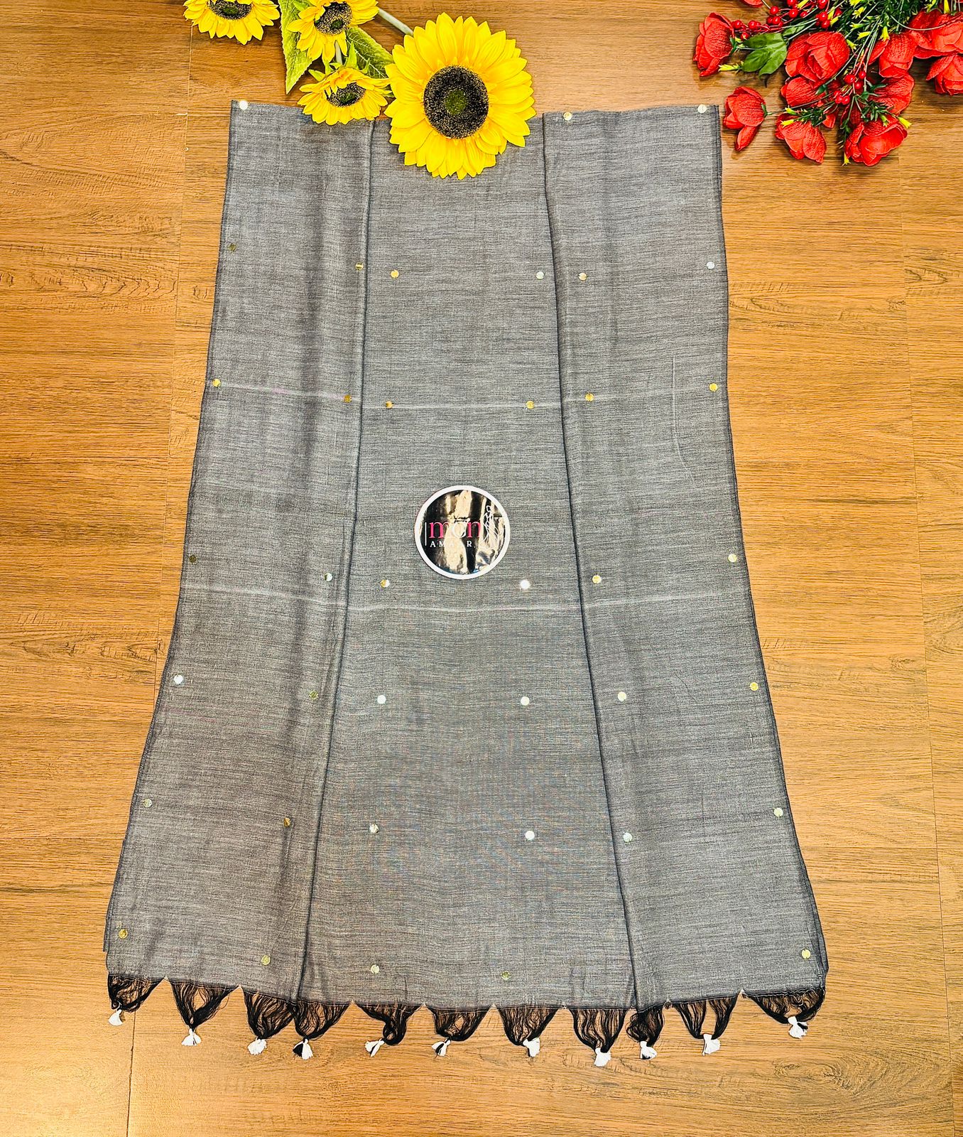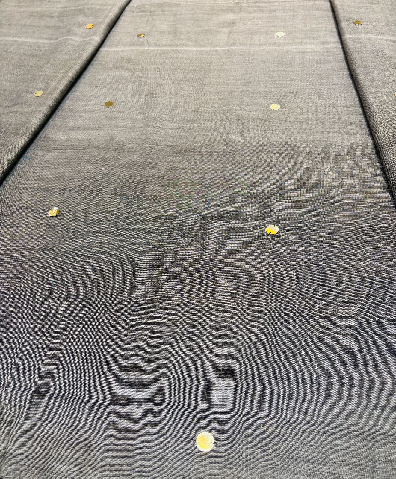 Indulge in luxury with our Gray Coin Bengal Khadi Saree. Made from pure khadi cotton, this saree is adorned with delicate gini size sequins, adding a touch of elegance and sparkle. Perfect for any occasion, elevate your style with this sophisticated and glamorous saree.
