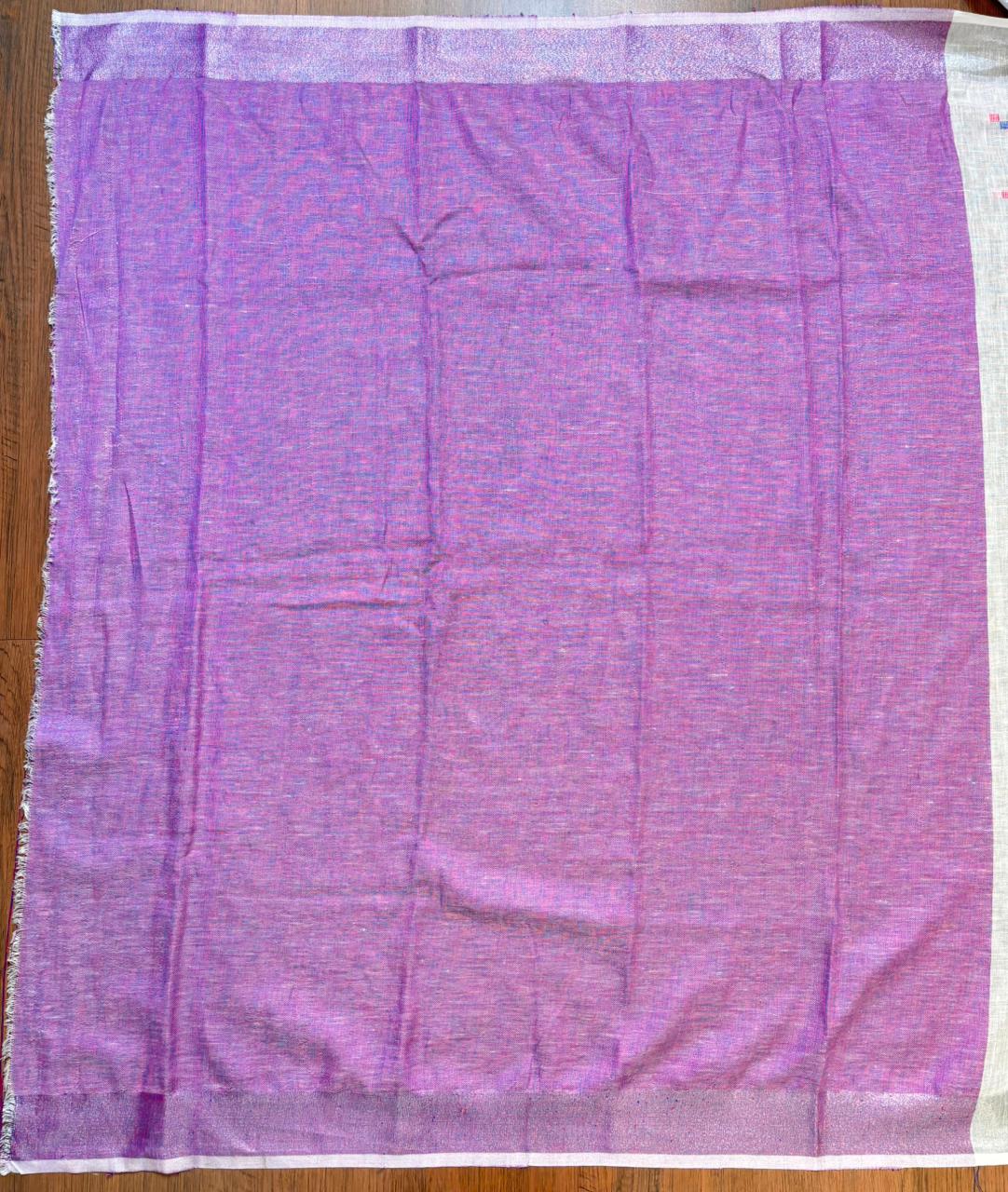 This Pure Linen Saree is crafted from premium linen fabric, featuring detailed weaving work across the saree. The designer Pallu is enhanced with delicate tassels and a sophisticated silver Zari border, highlighting its artisanal quality. Combining traditional elegance with breathable comfort, this saree is ideal for special occasions and those who appreciate refined craftsmanship.