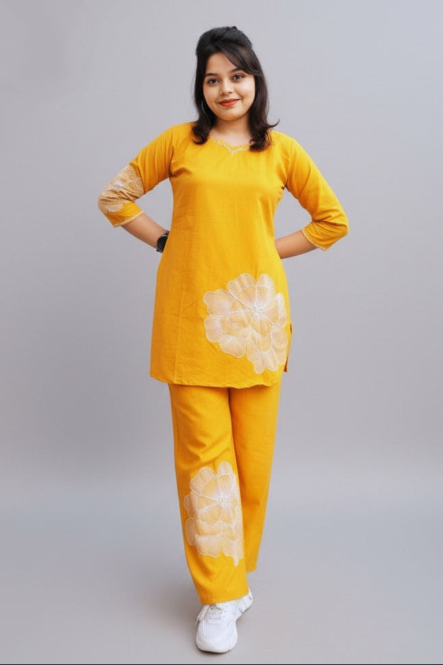 This Set features Embroidery work , its Top and matching pant make it an eye-catching ,perfect for any occasion, Office wear, casual outings.