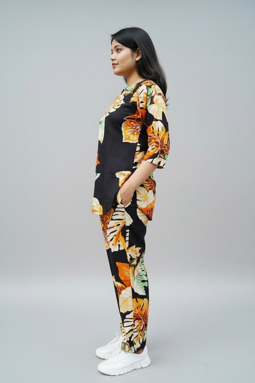 This Set features all over vibrant prints . Its Top and matching pant make it an eye-catching ,perfect for any occasion, Office wear, casual outings.
