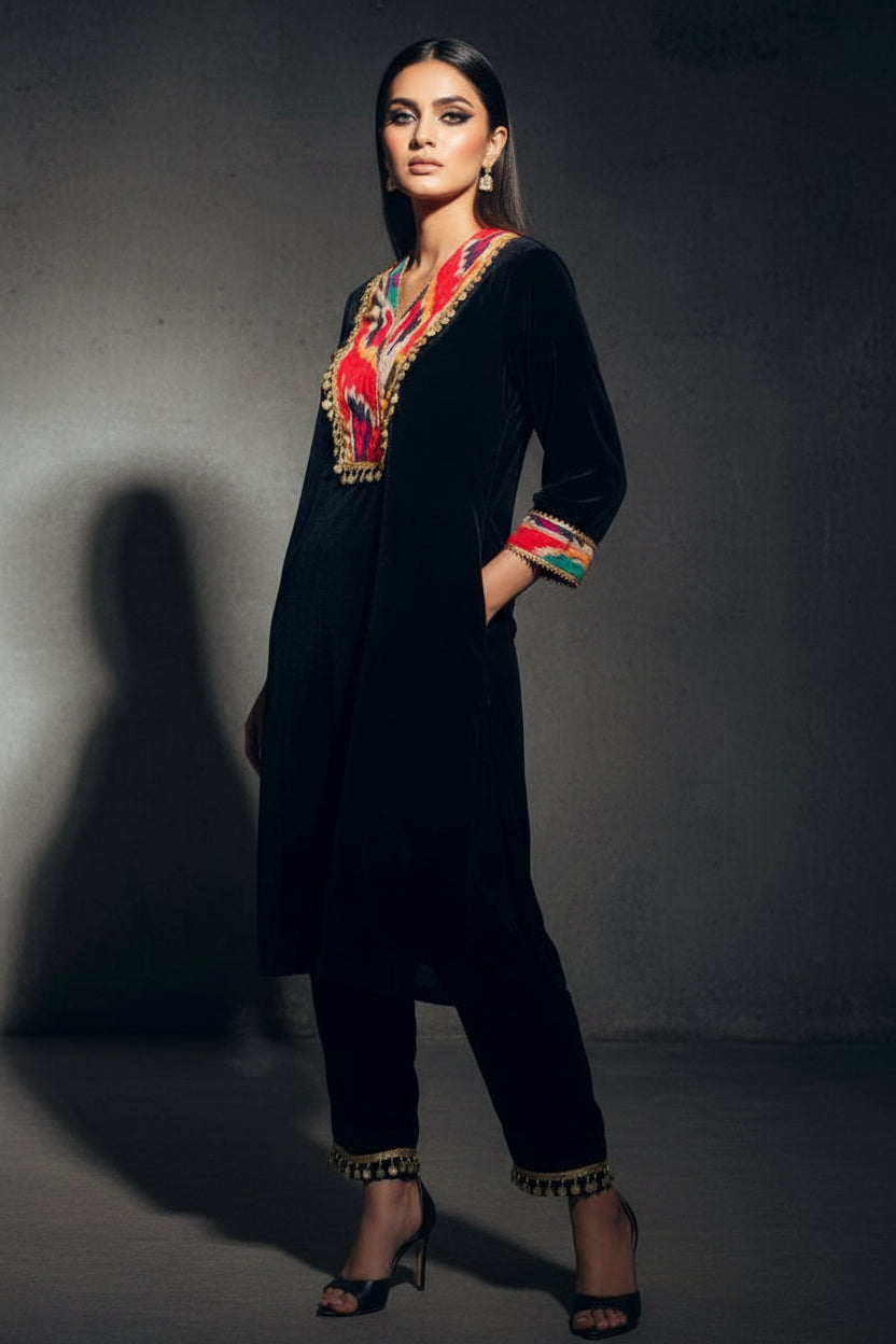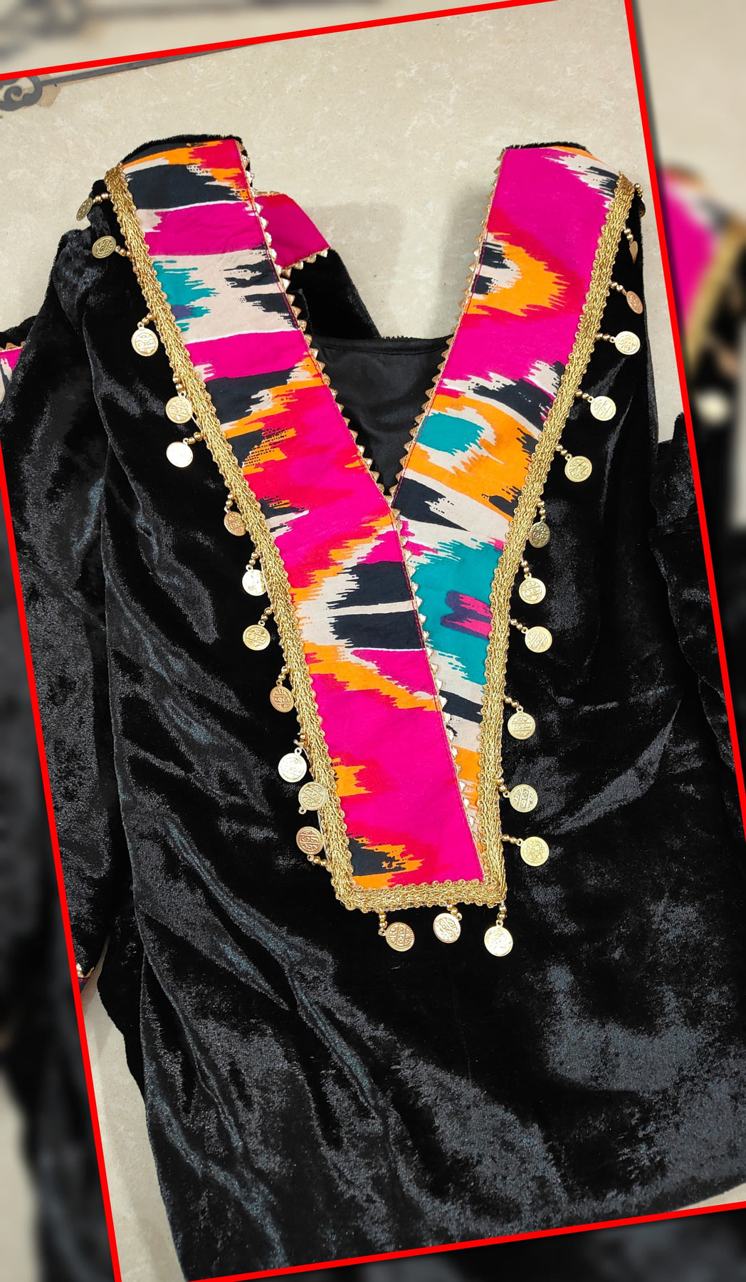 Introducing our Black Color velvet Coord Set a timeless classic for versatile elegance. This stunning coords set features likes print work that is trendy and gorgeous. Made with high-quality velvet, this set is not only cool but also comfortable to wear. Elevate your style game with this must-have set!