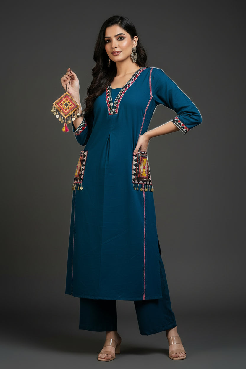 Enhance your wardrobe with this elegant 2-piece "A Dreamy Evening Cotton Kurti Set outfit. The charming fabric, intricate embroidery work and lightweight - all these features make it a must-have for any fashion enthusiast. Also, bright tone is perfect for any auspicious occasion.