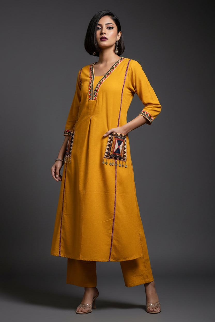 Enhance your wardrobe with this elegant 2-piece "A Dreamy Evening Cotton Kurti Set outfit. The charming fabric, intricate embroidery work and lightweight - all these features make it a must-have for any fashion enthusiast. Also, bright tone is perfect for any auspicious occasion.