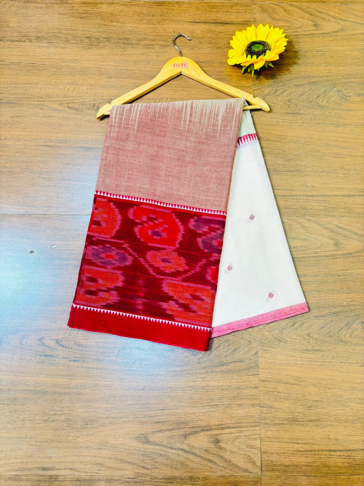 This saree combines the finest Dhonekhali cotton fabric with traditional Ikkat weaving, showcasing expert craftsmanship. The breathable cotton fabric ensures comfort, while the intricate Ikkat patterns add cultural richness and elegance. Perfect for those who appreciate timeless artistry and quality in their attire.