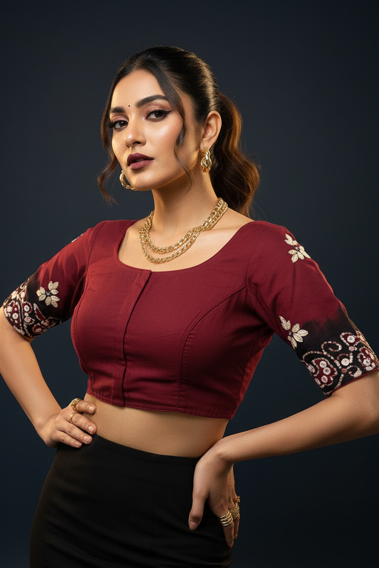 Bring some designer flair to your wardrobe with this cotton blouse featuring a unique batik print. Offered in the best maroon color, it's the perfect playful addition to any outfit. Spice up your style with this quirky blouse!