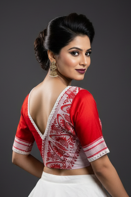 Hurry and snag these savings! Get ready to stand out with Puja Special Fancy Designer Blouse! This unique Blouse features a Bengali traditional Style design and Assamese Gamcha Style weaving at the back, creating a bold and eye-catching look. Stay stylish and embrace cultural influences with this must-have blouse.