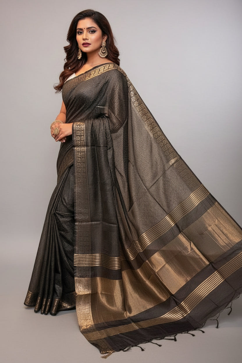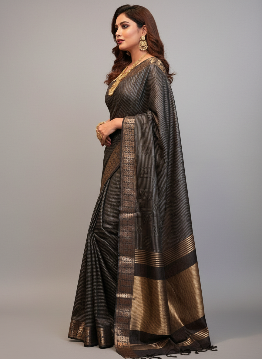 This exquisite Saree Selfie Designer kota Silk [Bhagalpuri ] Saree showcases silk saree material and intricate zari weaving all over, highlighted by stunning kantha style weaving in body. The luxurious and refined designs extends to the pallu and border. The saree is complemented with traditional designs. Elevate your fashion game with this premium and classic saree.