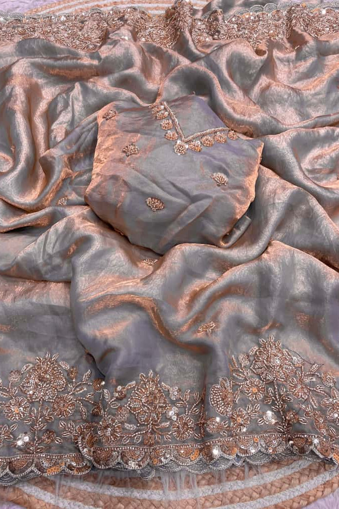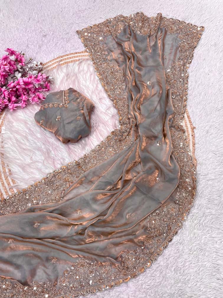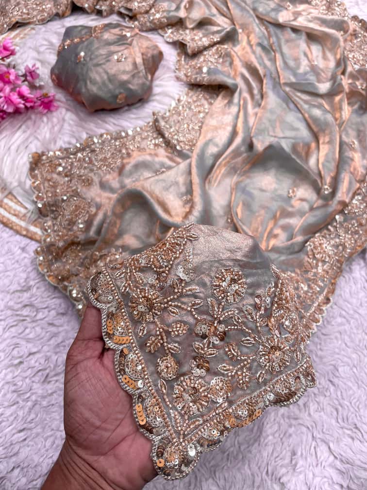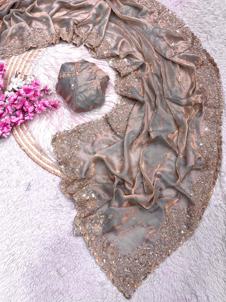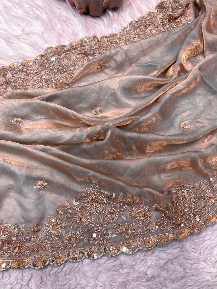 Elevate your look with the Storyteller’s Embrace Fancy Silk Saree. Made from premium fancy space silk with sequins embroidery and fancy moti work, this saree is perfect for any special occasion, and its lightweight and some kind of smooth and soft fabric adds a touch of shine. Embrace tradition and style with this very ancient and timeless saree