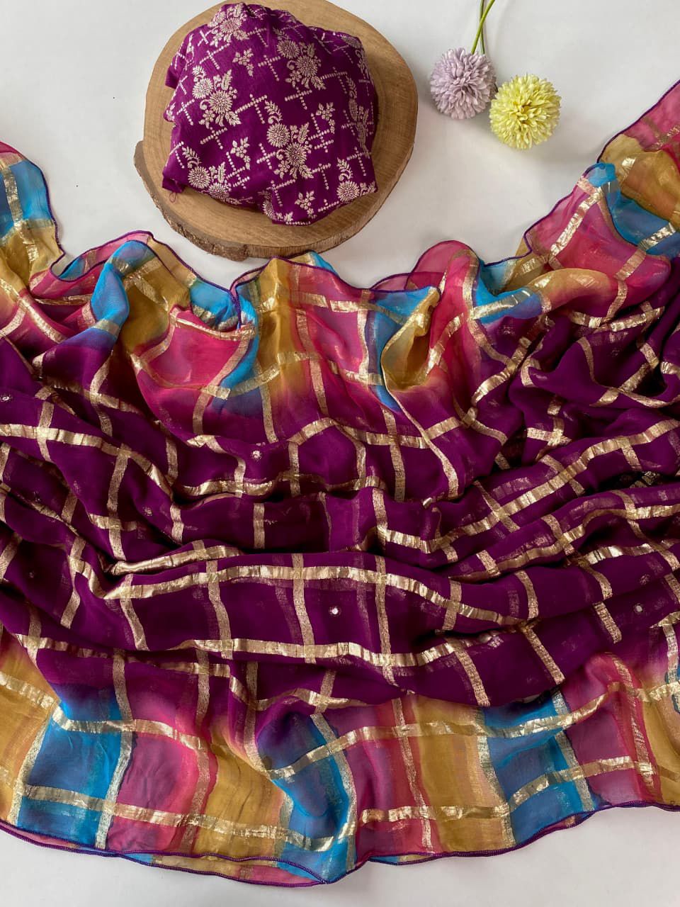 Enhance your elegance with this stunning Viscose Georgette Saree [ fancy], meticulously crafted to perfection. The saree features gold zari chex design throughout, adding a touch of opulence and traditional charm. The mirror work [ fancy] complements the rich, flowing texture of the viscose fabric, creating a graceful drape that moves beautifully with every step.