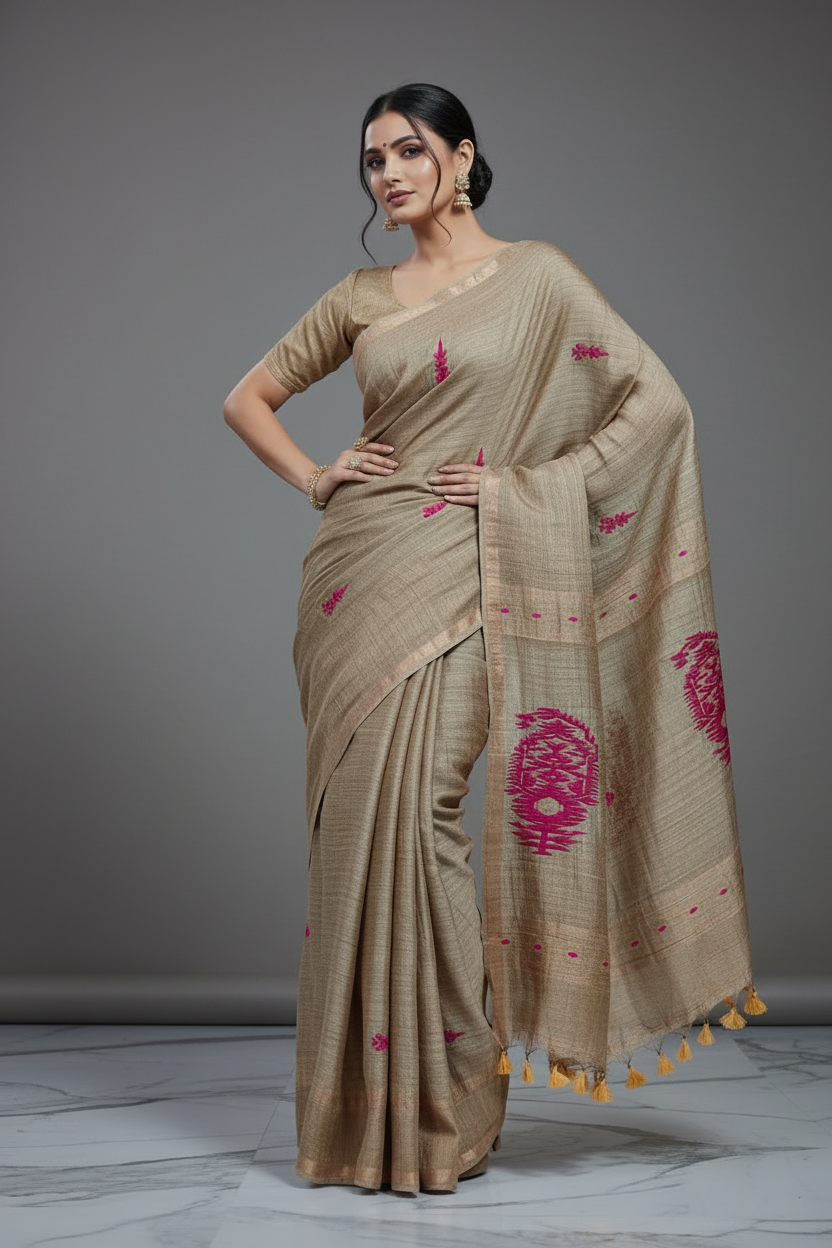 - Note: The color of the images may differ somewhat from those taken during the day. Handloom sarees are woven by hand, they may have a few extra or missing threads. These do not qualify as flaws because they are natural processes.