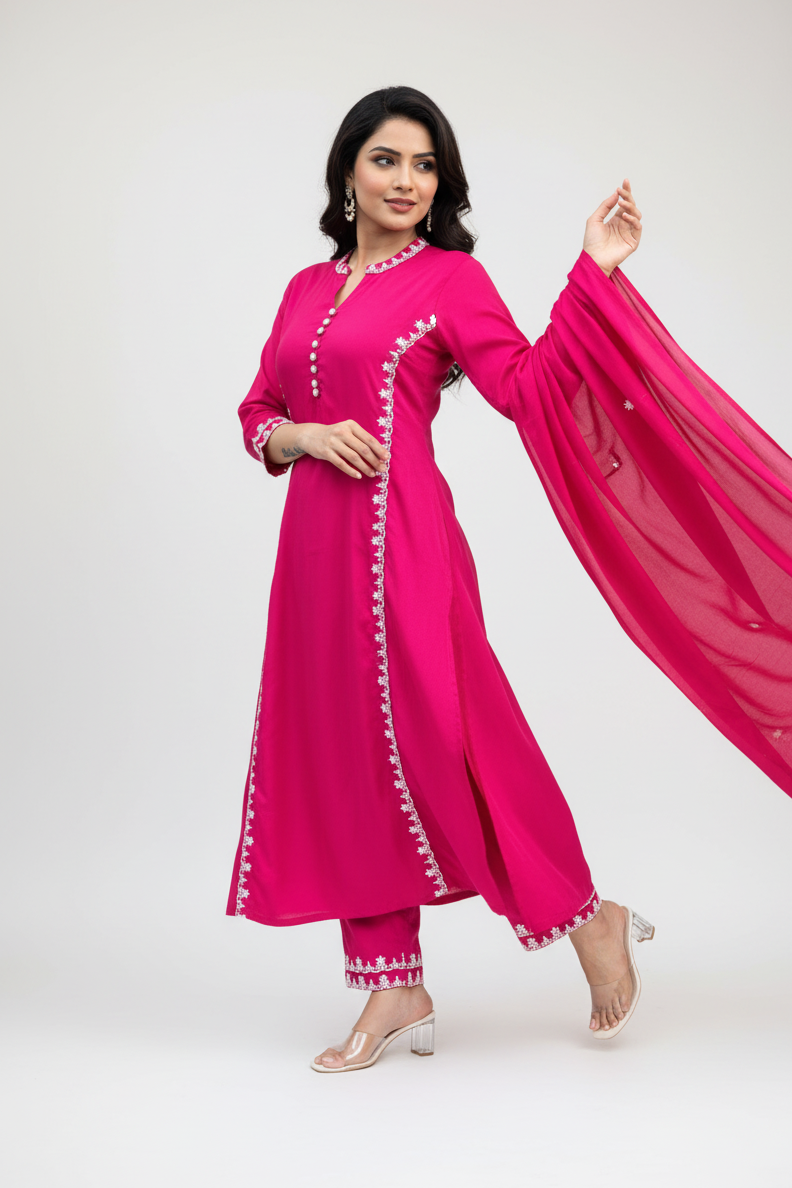 Introducing our soft Cotton Kurti Set a timeless classic for versatile elegance. This stunning Kurti set features likes embroidery work that is trendy and gorgeous. Made with high-quality cotton , this set is not only cool but also comfortable to wear. Elevate your style game with this must-have set!