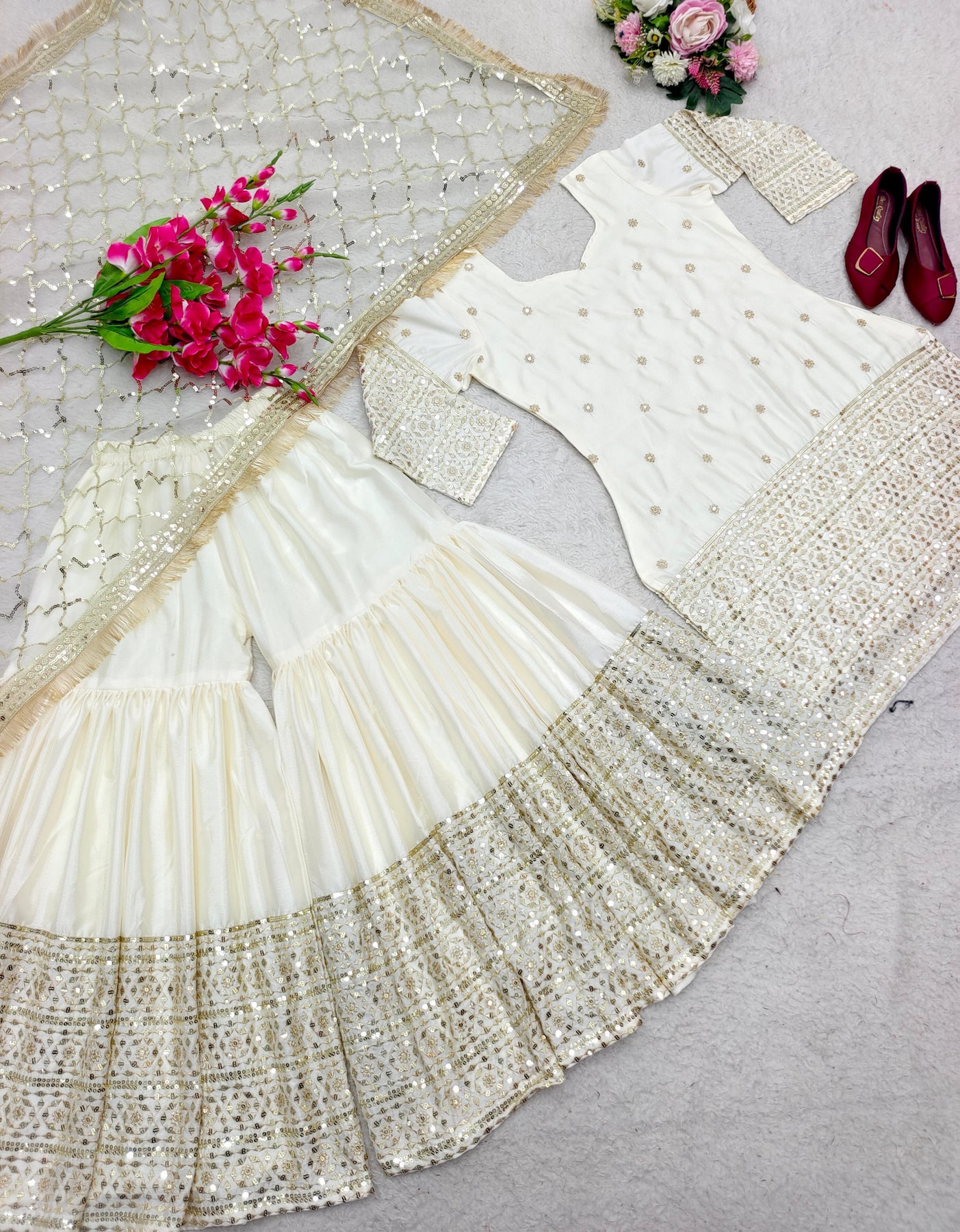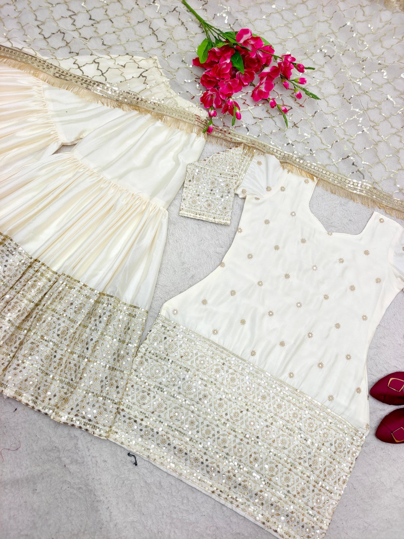The White Satin Silk Sharara Set allows you to express your timeless beauty. It is noted for its elegant and sophisticated appearance, which is achieved using the finest satin silk [ fancy] fabric and sequins embroidery work. Its easy-to-wear design makes it appropriate for any occasion. This traditional and elegant ornament will elevate your look.