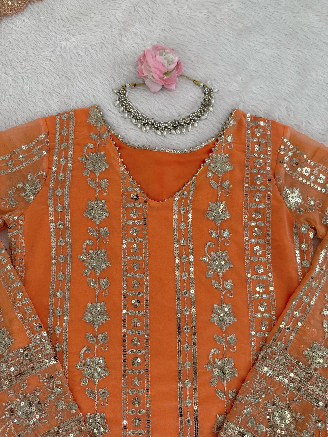 Dream Girl Diva Georgette Sharara Set allows you to express your timeless beauty. It is noted for its elegant and sophisticated appearance, which is achieved using the finest georgette [ fancy] fabric and  thread sequins work. Its easy-to-wear design makes it appropriate for any occasion. This traditional and elegant ornament will elevate your look.