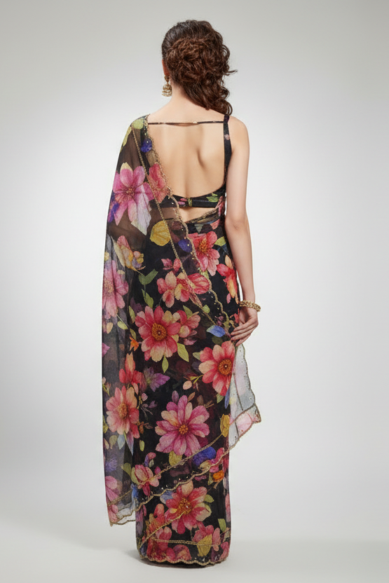 Add some unique charm to your wardrobe with our Teby Organza Saree! Made of soft organza, this saree features Beautiful floral print with cutdana work in saree. Perfect for special occasions, it also comes with a contrast work blouse for a complete and stylish look. Step out in style today!