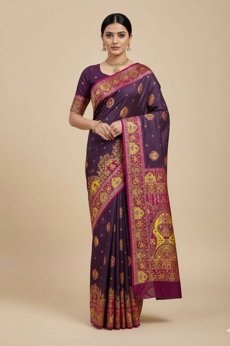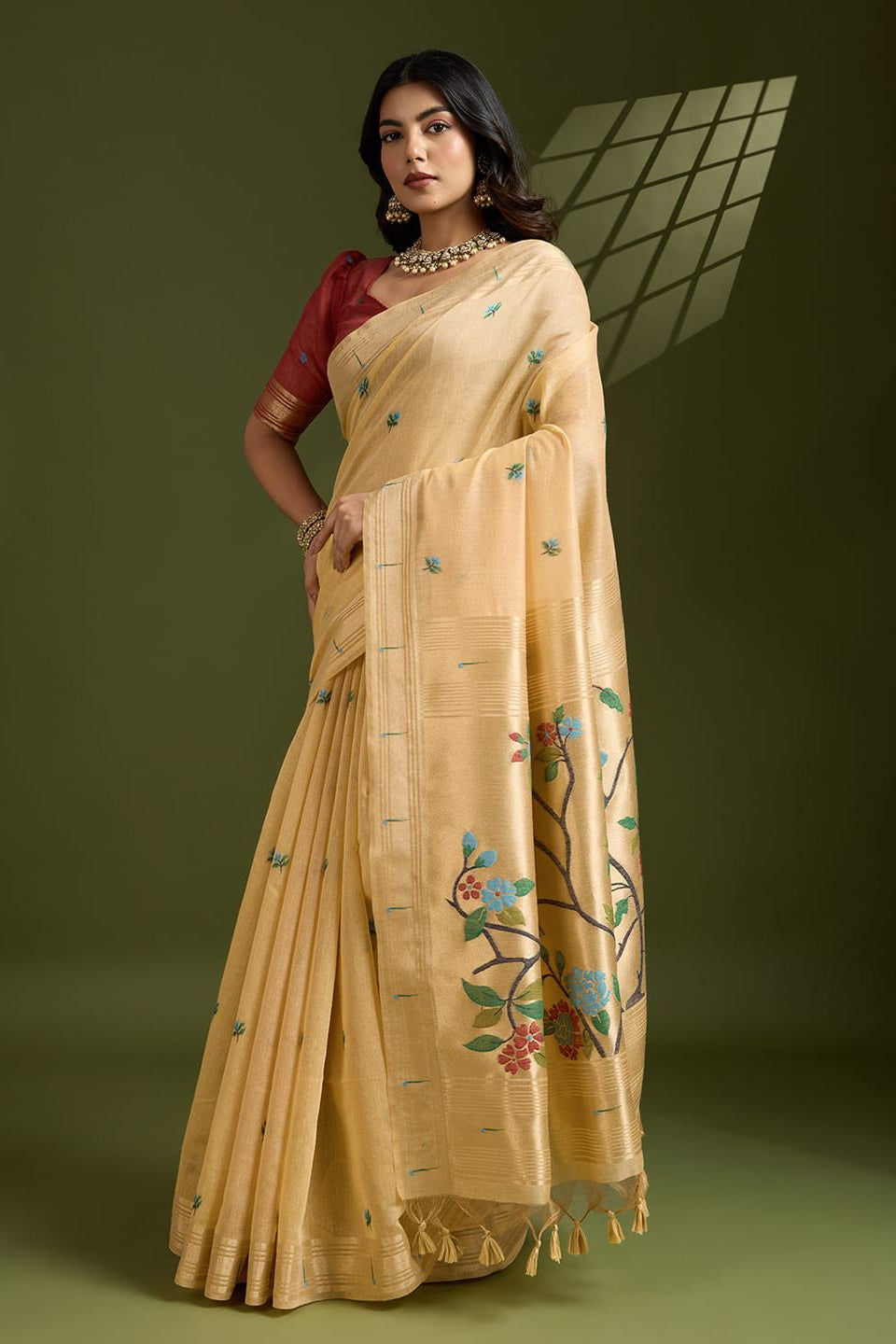 The Paithani saree originated from the small town of Paithan in Maharashtra. Paithani sarees reflect the culture and socio-cultural traditions of Maharashtra. The earlier Paithani saree is the garment of every Maharashtrian bride. The Paithani silk saree is renowned for its rich ornamented zari pallu and border, which has a square design. The Paithani saree is famous all over the world for its uniqueness in design, textures, and colours. The Paithani silk saree is characterised by the luxurious use of gold and contains bird-inspired motifs like peacocks and parrots, which add to its uniqueness. The Paithani saree is very important in Maharashtra’s tradition and occasions.