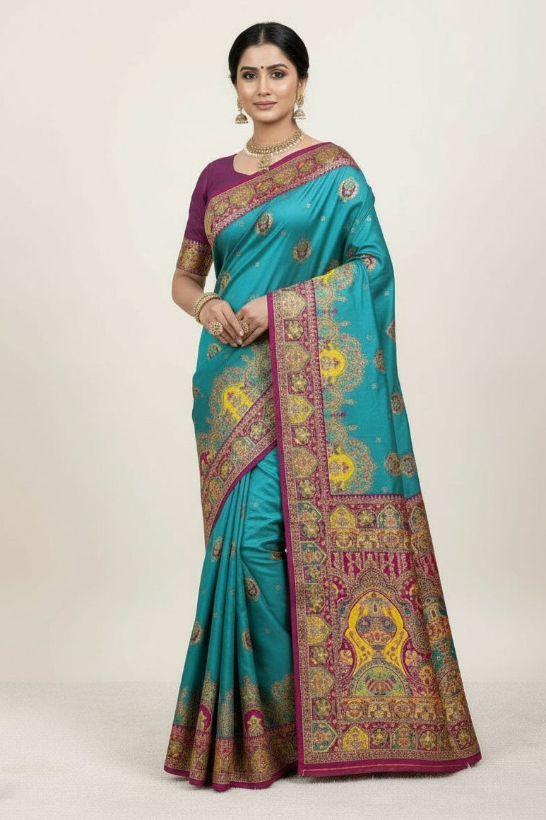 Experience luxury and tradition with our Paithani Silk(Blended) Saree. Crafted with multicolor paisley border and pallu Comes with a contrasting enhanced with elegant woven motifs. Elevate your wardrobe with this elegant and timeless piece.