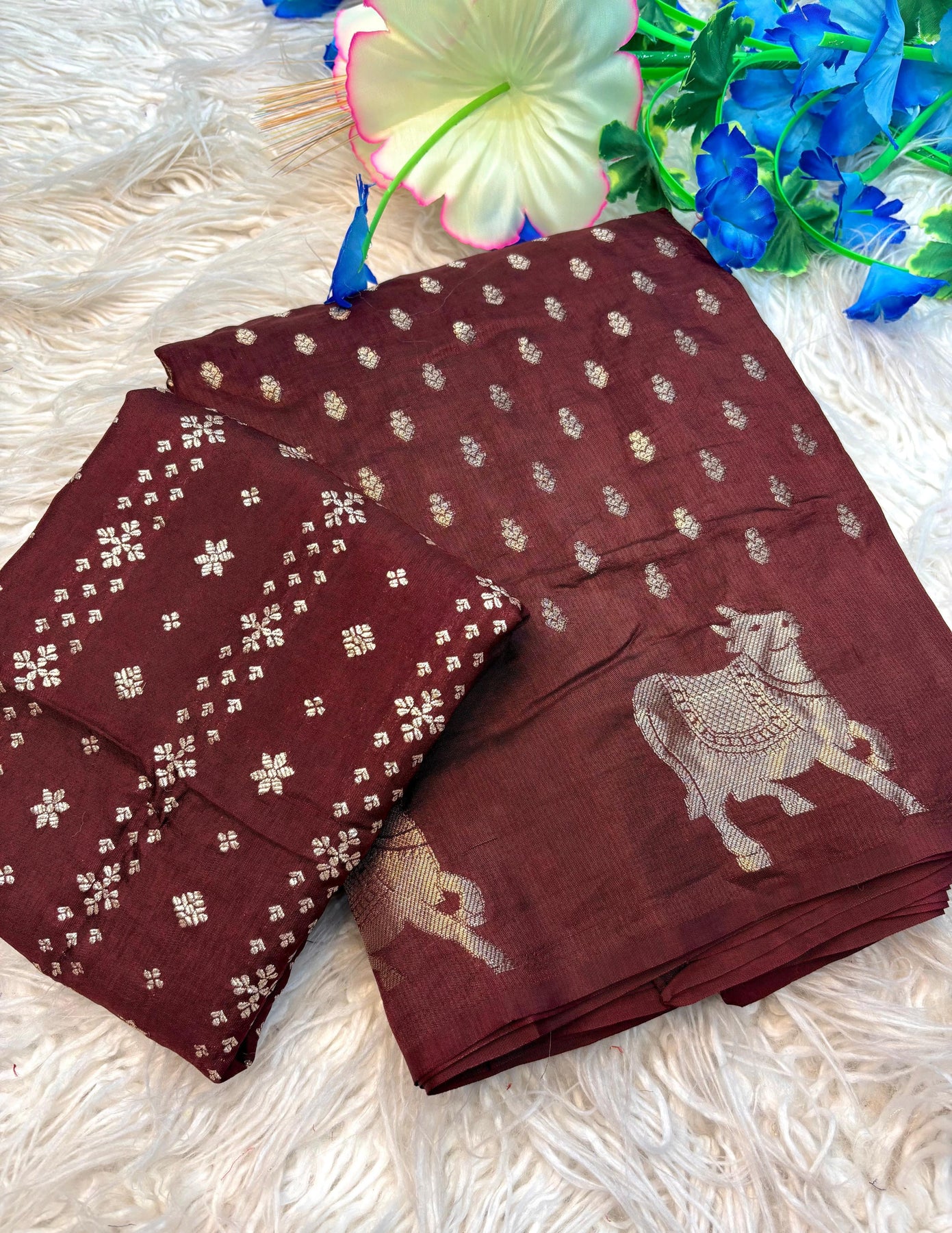 Adorn yourself with the beauty of Dewlight Grace Fancy Dola Silk Saree. Crafted from fancy dola silk and embellished with exquisite jacquard zari weaving and viscose jacquard blouse, this saree is sure to make a statement. Fall in love with its delicate elegance and timeless charm.