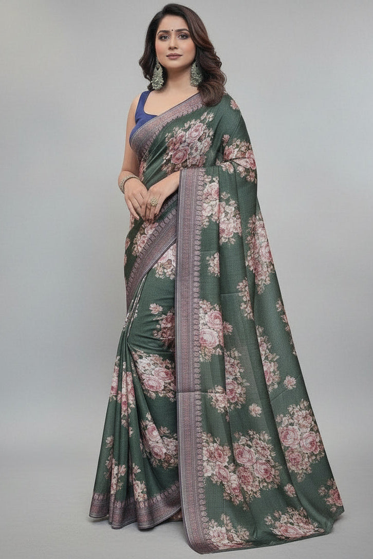 - The saree features stunning digital prints that are vibrant and contemporary, offering a modern twist to the traditional look. The prints are designed to stand out, making you the center of attention at any event