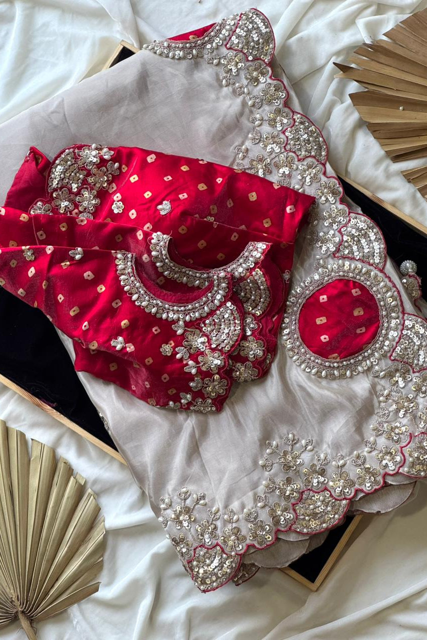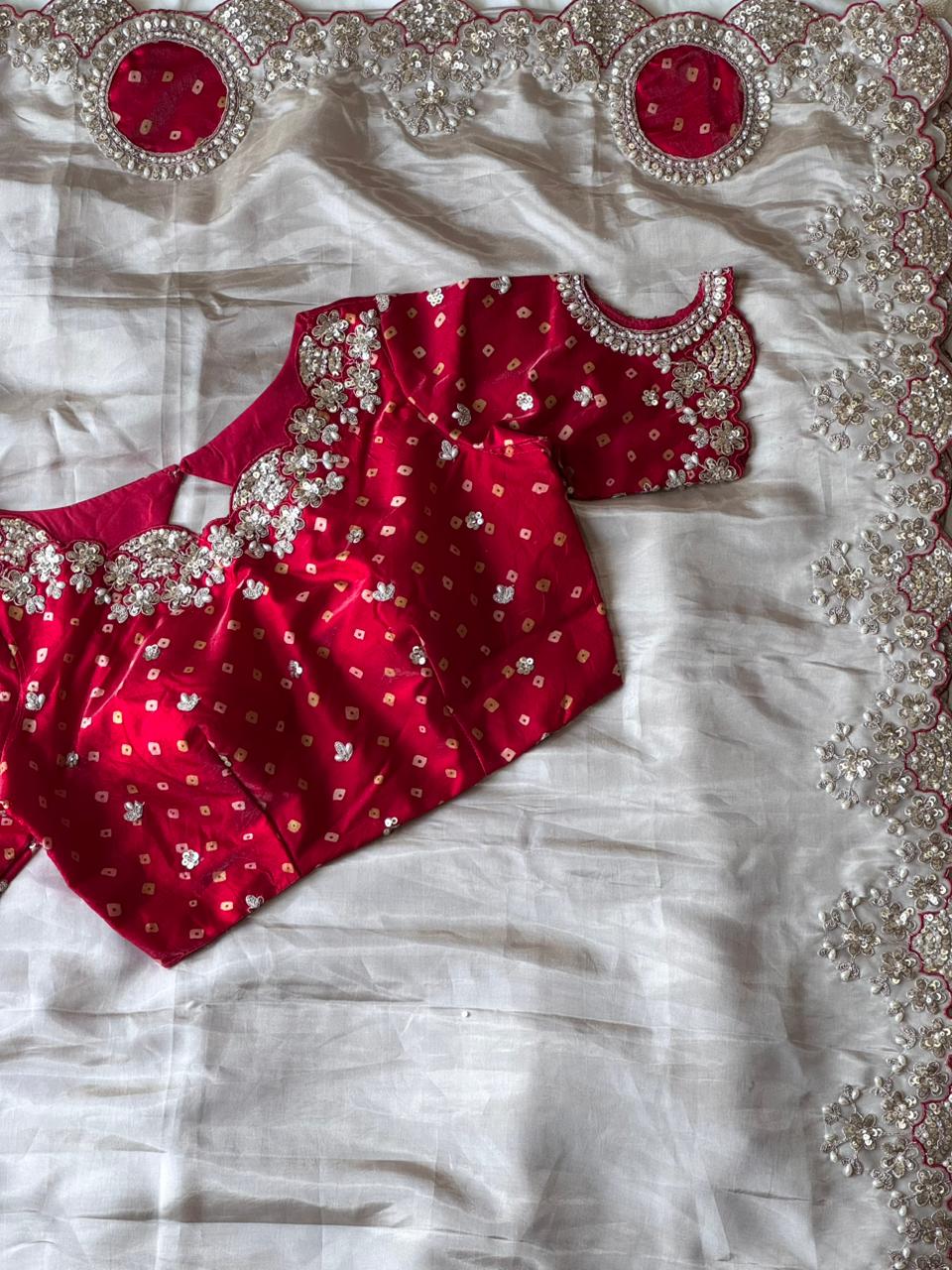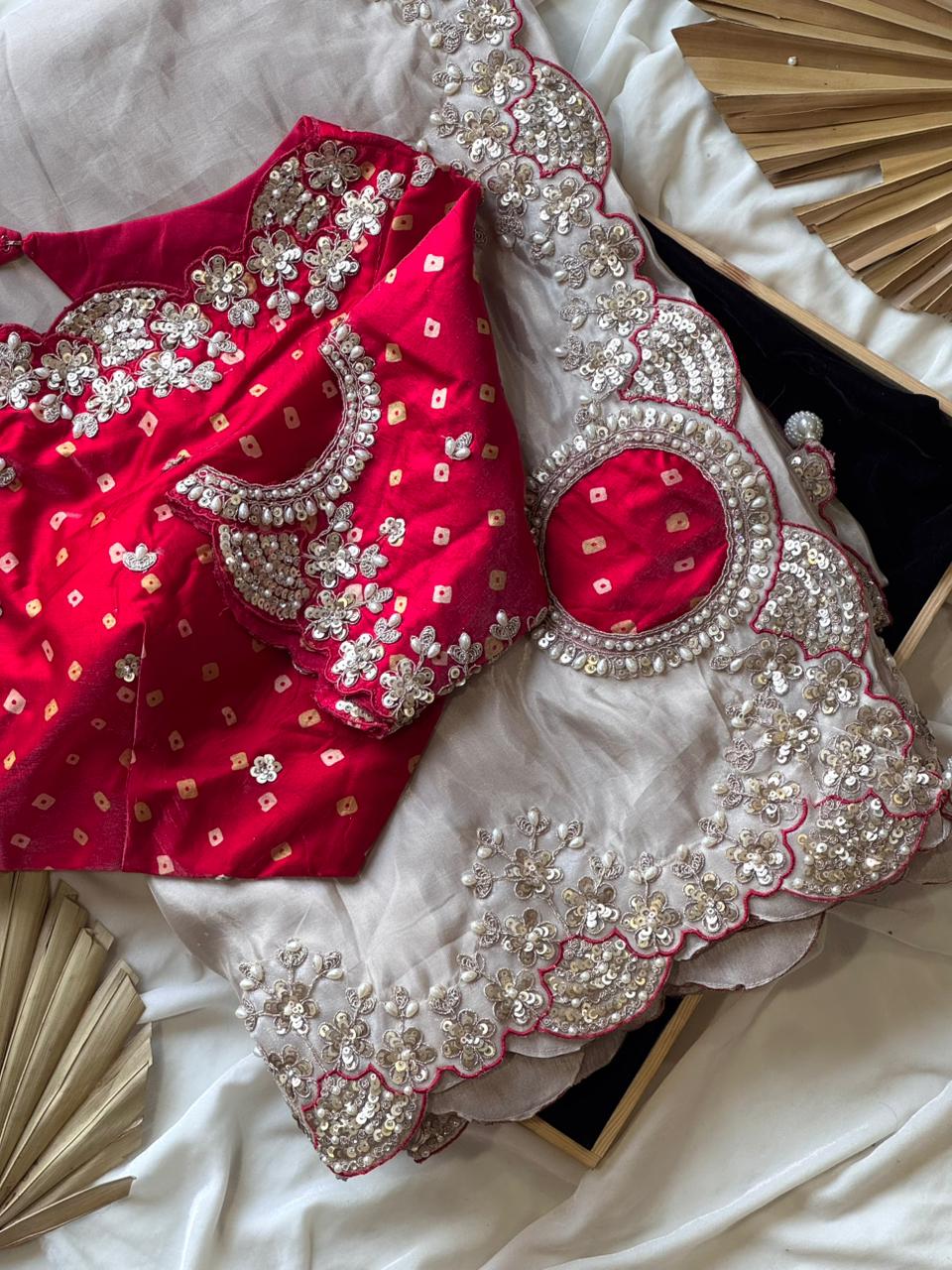 - Blouse -bandhani with fancy pearls and sequins style coding work is there[ stitched blouse ]