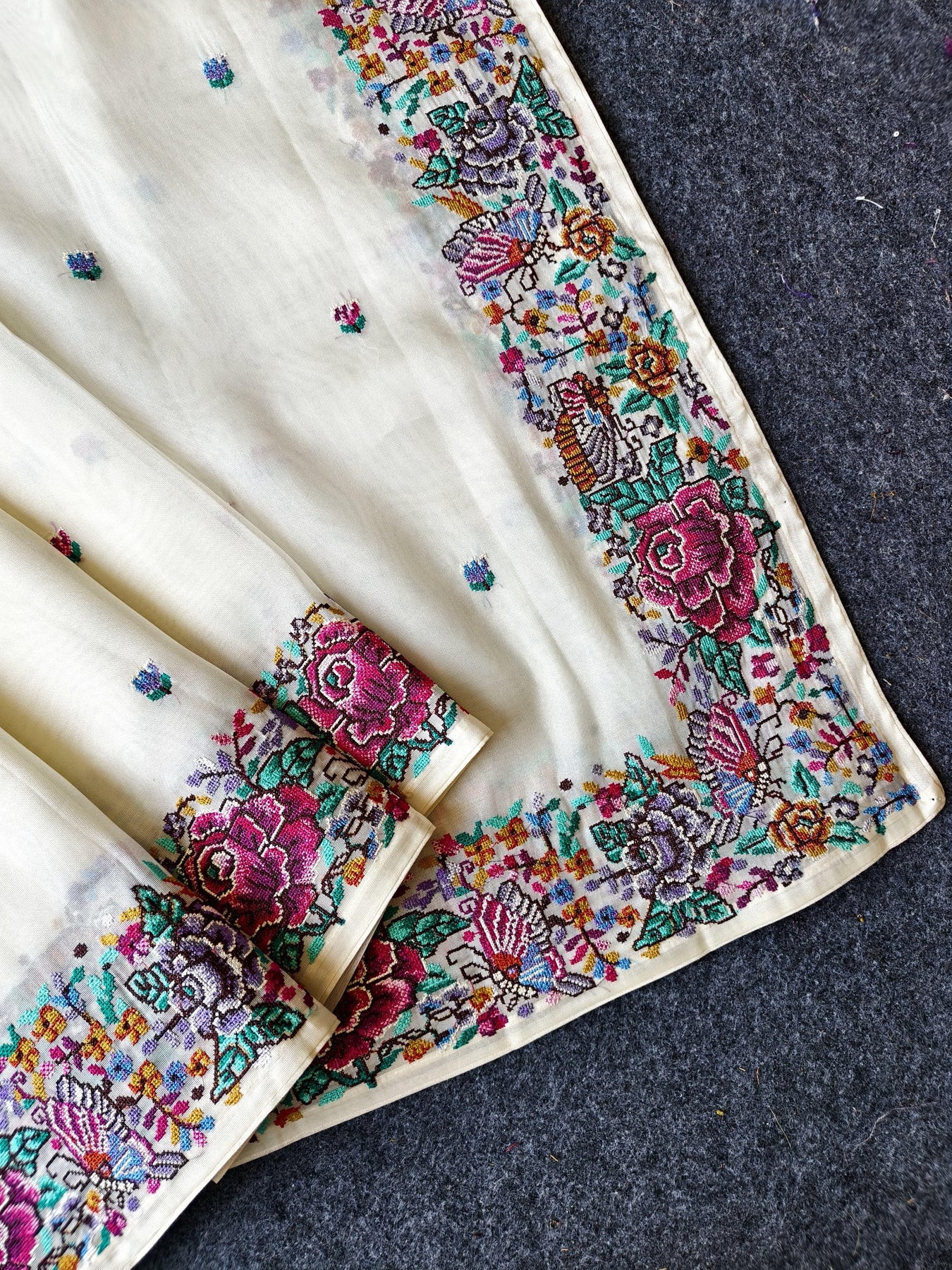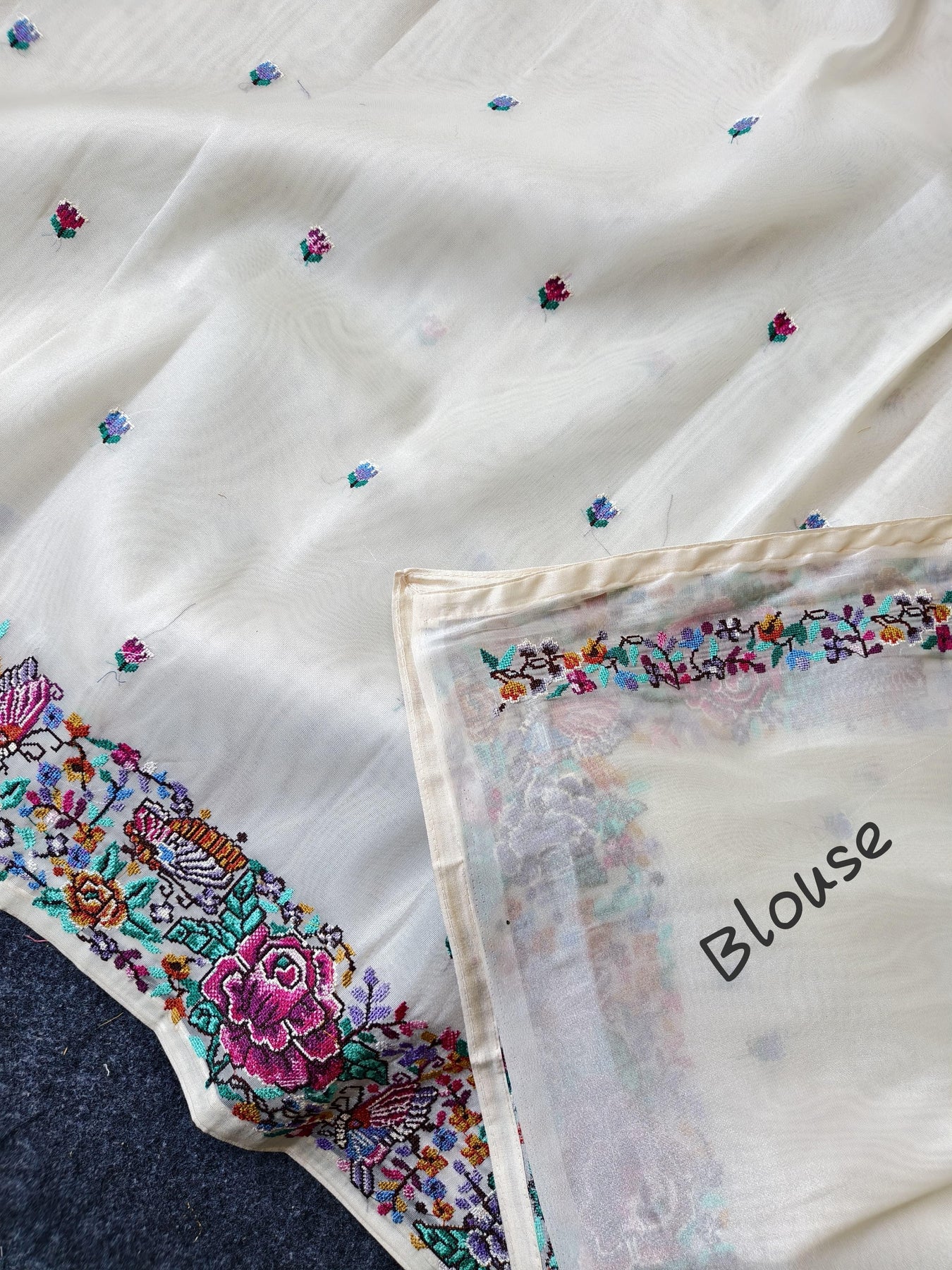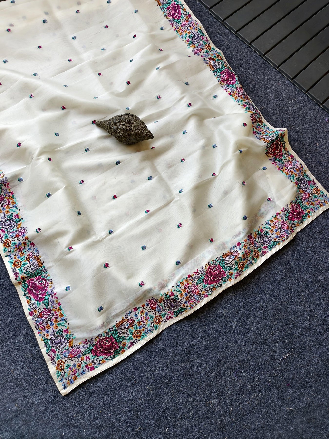 Delight in the ultimate sophistication of Blush With Designer Embroidery Tissue Silk Saree. Crafted with high-quality Tissue [ fancy]  and intricate flower embroidery design on border, this saree exudes opulence and uniqueness. The saree is accompanied by a Blouse piece  and is a distinguished piece from the designer's selection of premium fabrics.