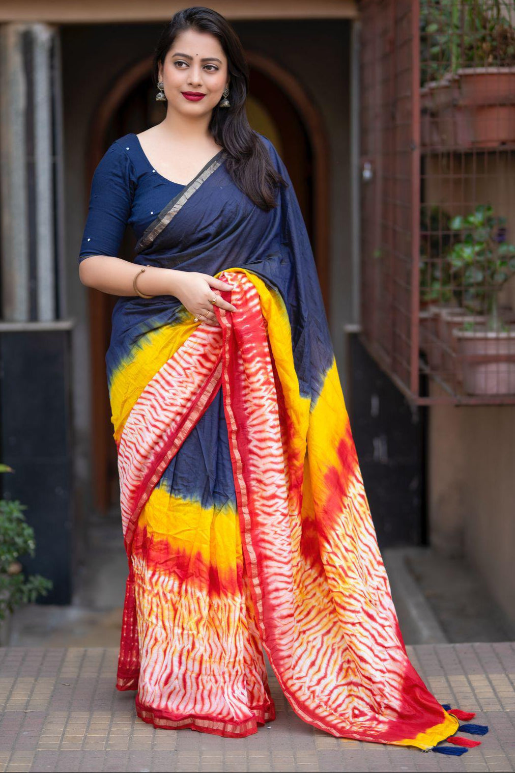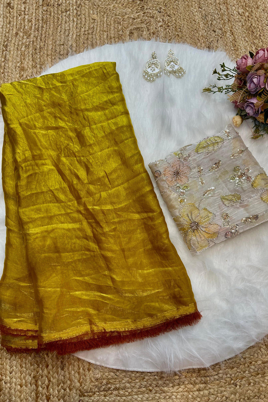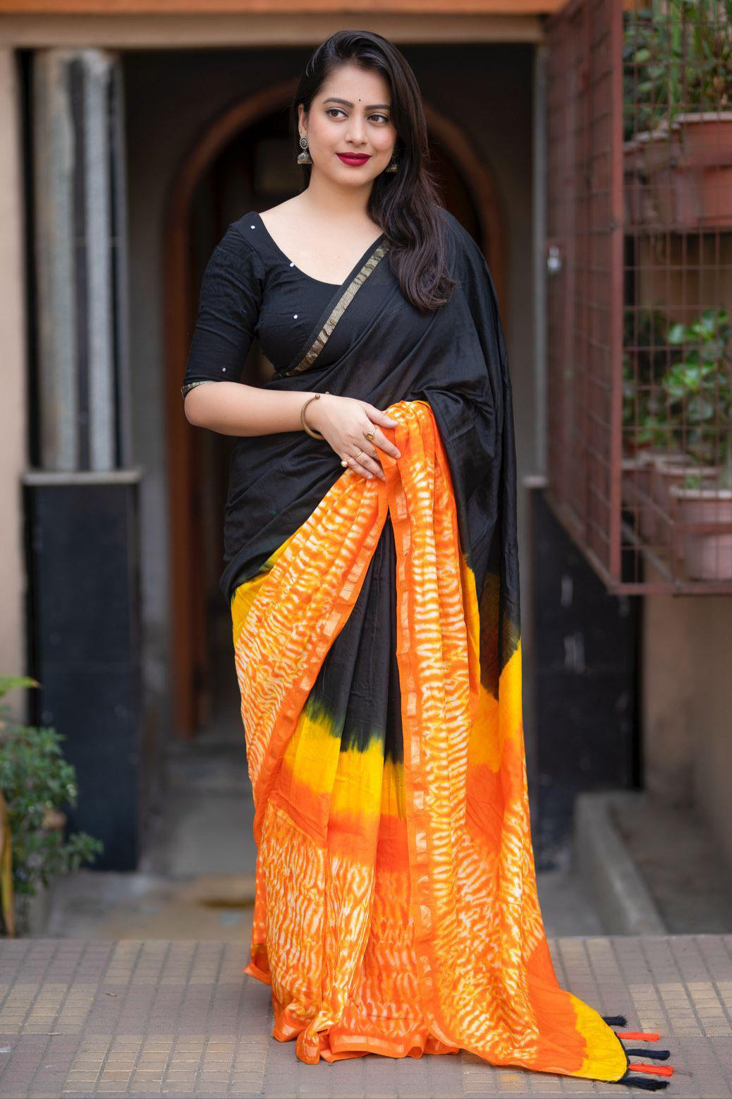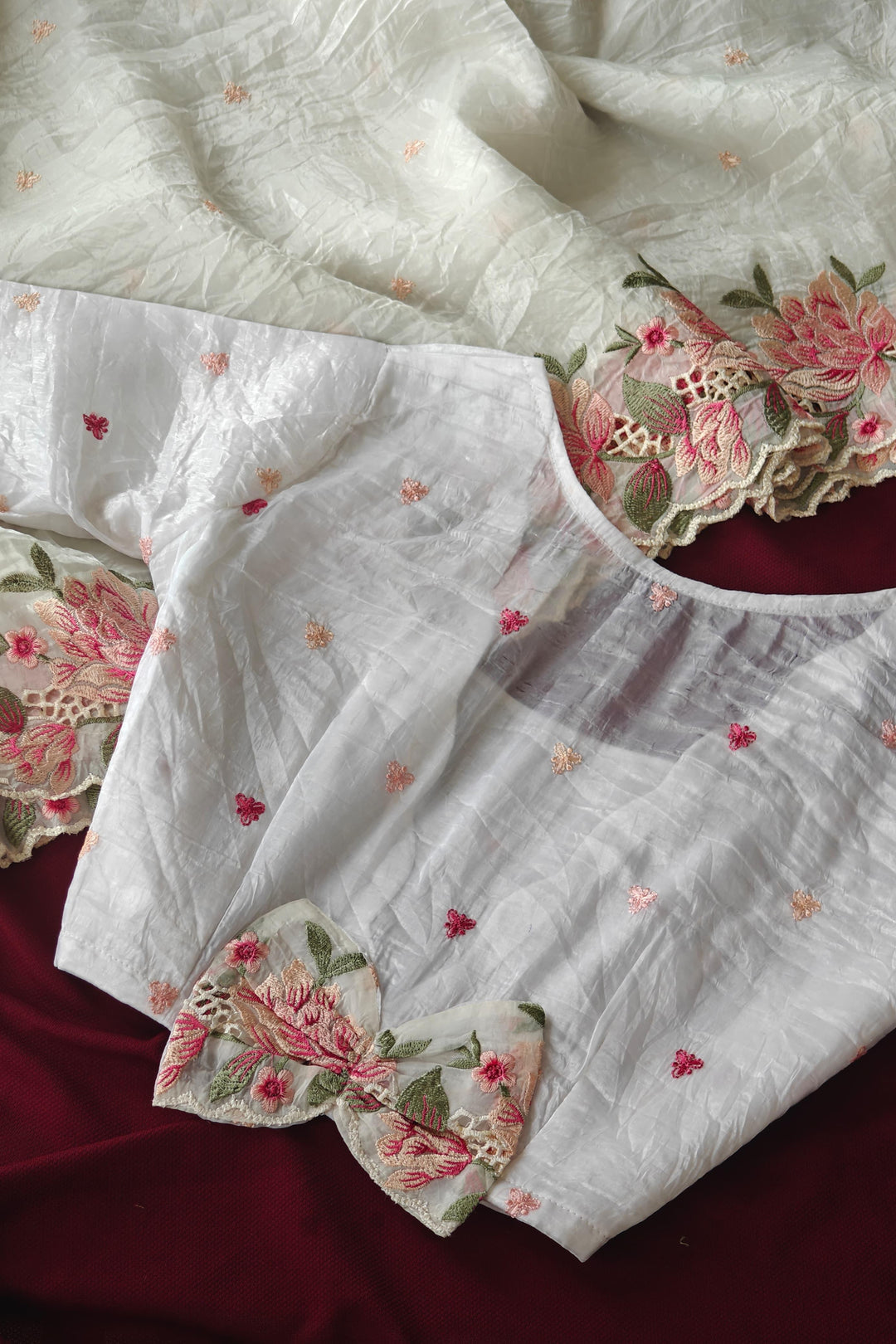 - You've probably seen photographs of models wearing a short kurti with their silk saree when looking for silk sarees online. This is an iconic aesthetic that most women desire to achieve, and it also helps to enhance the look! This style elevates your appearance while subtly concealing your contours. Add your favorite set of hefty earrings to complete this outfit perfectly!
