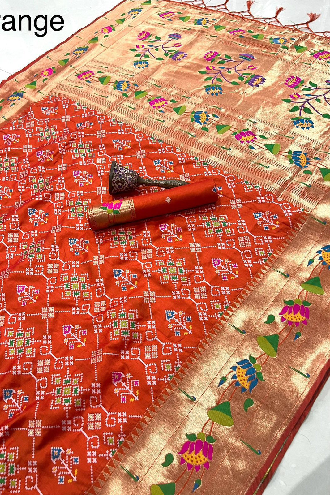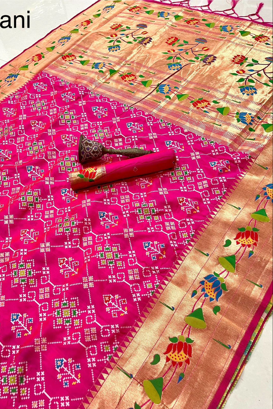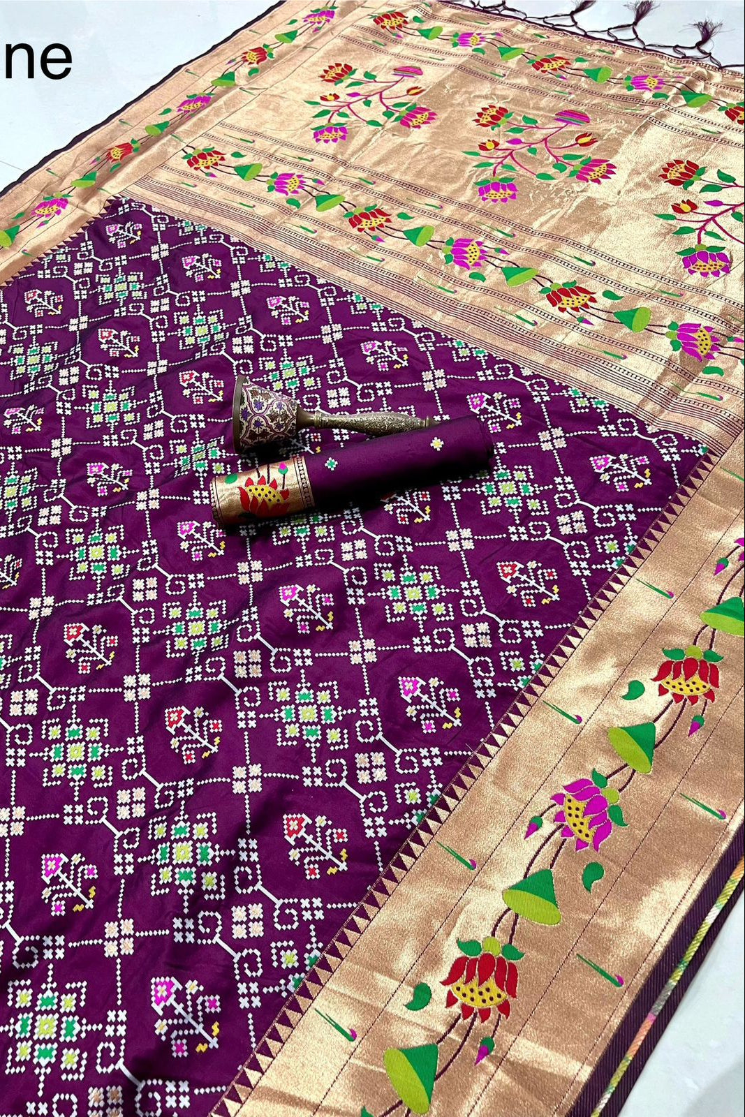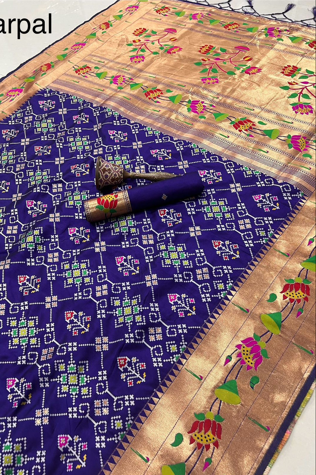Patolas are a regal collection of Silk sarees made in Patan, Gujarat. The shiny cloth that is painstakingly woven with accuracy and considered an art form. This majestic weave, draped by royals and aristocracy from a bygone age, is a double ikkat in which the warps and wefts are both colored into an intricate design using the warp & weft process while the craftsmen toil for more than 5 to 6 months. They are valued as a wardrobe gem due to their wide range of exquisite designs and color palettes. One of the most notable aspects of this saree is that it has the same appearance and feel on both sides. Patola sarees are classified into three types: Rajkot Patola, Banarasi Patola Silk Saree and Patan Patola.