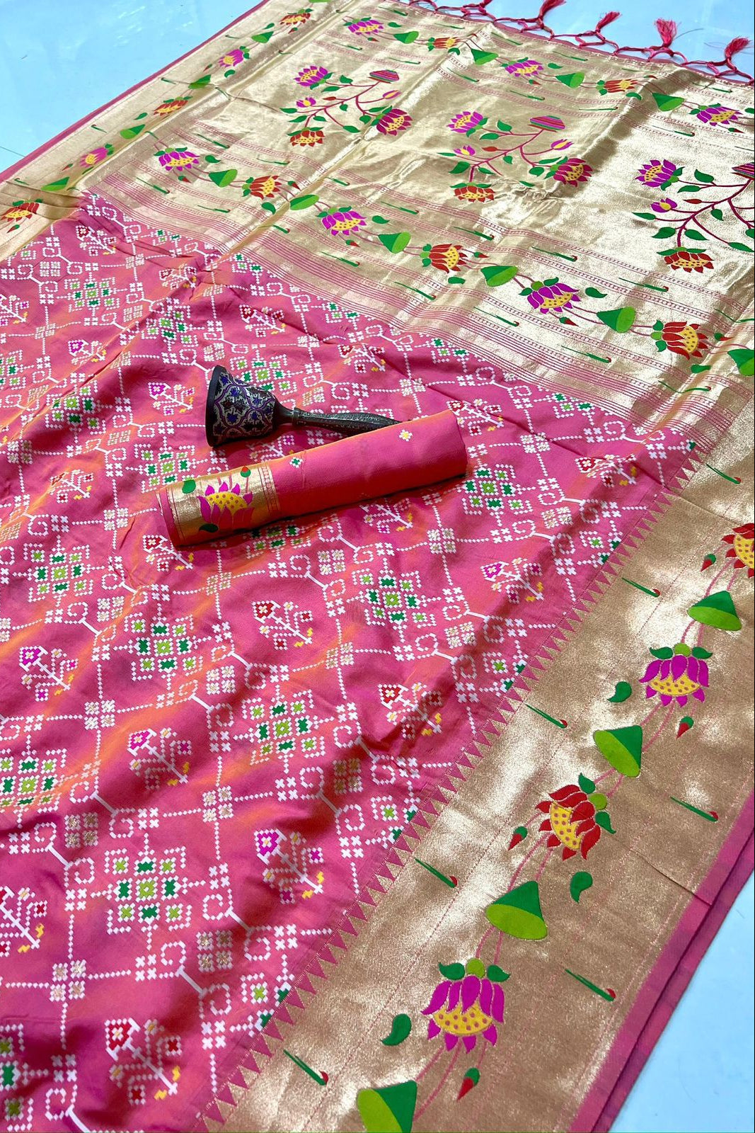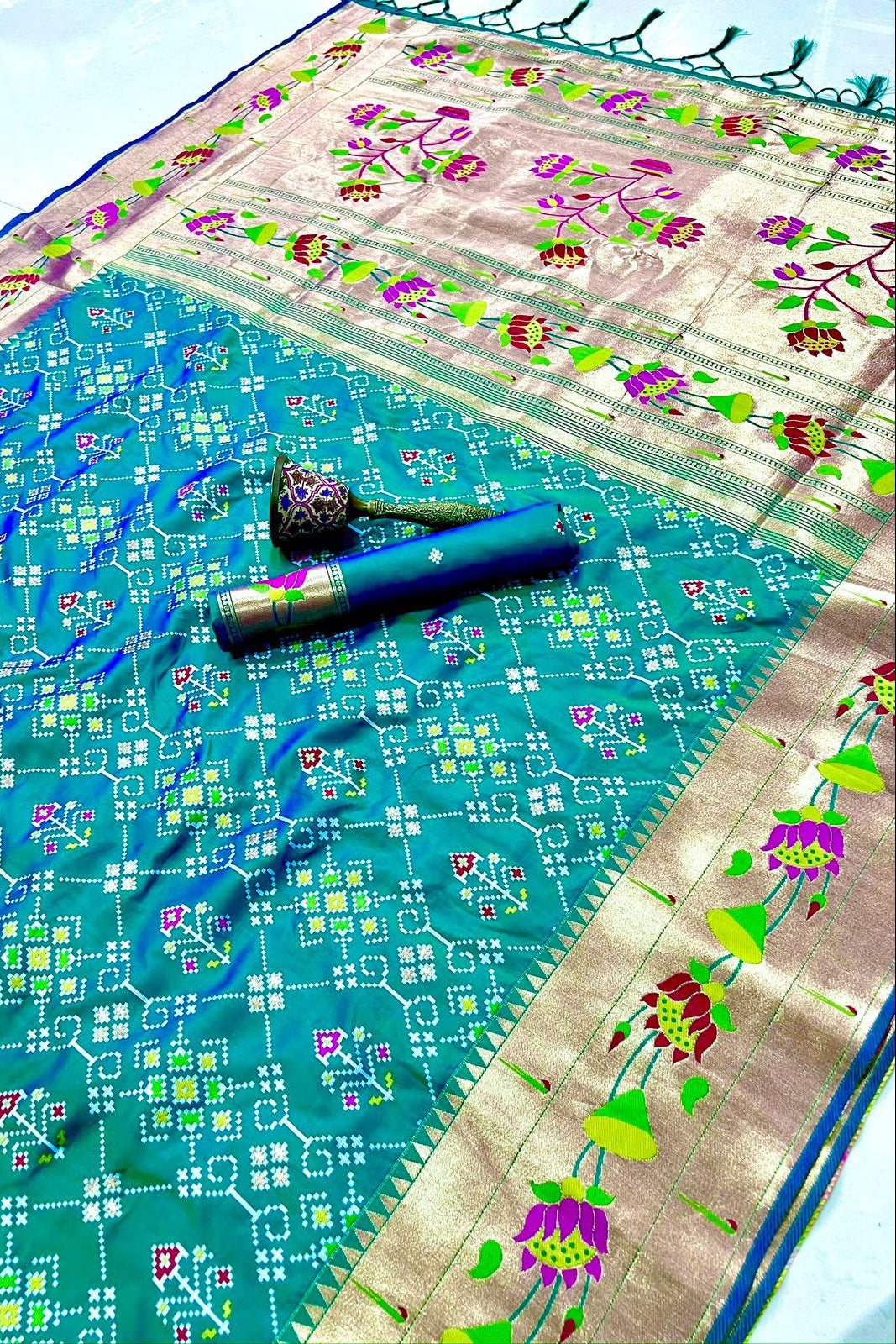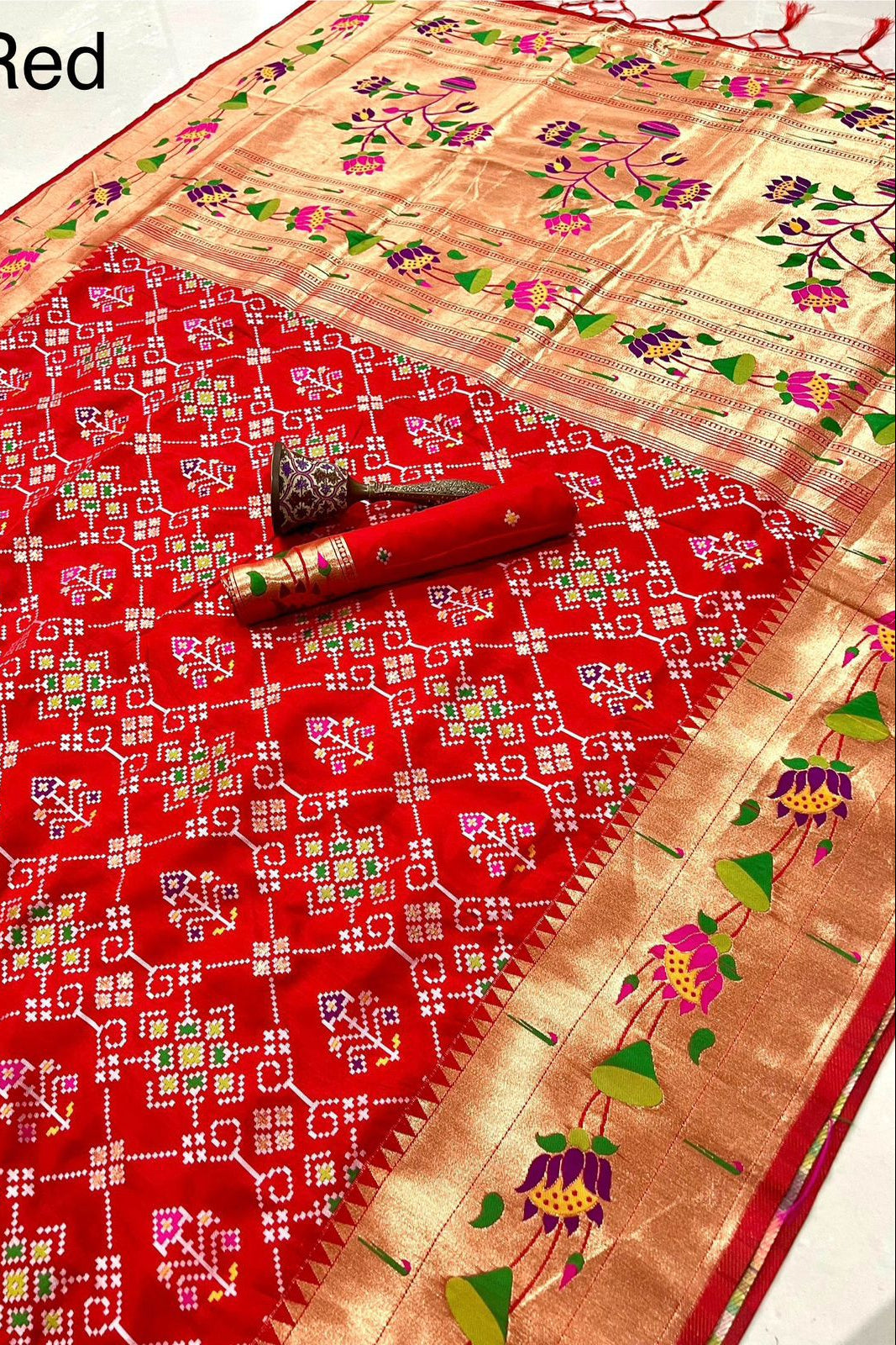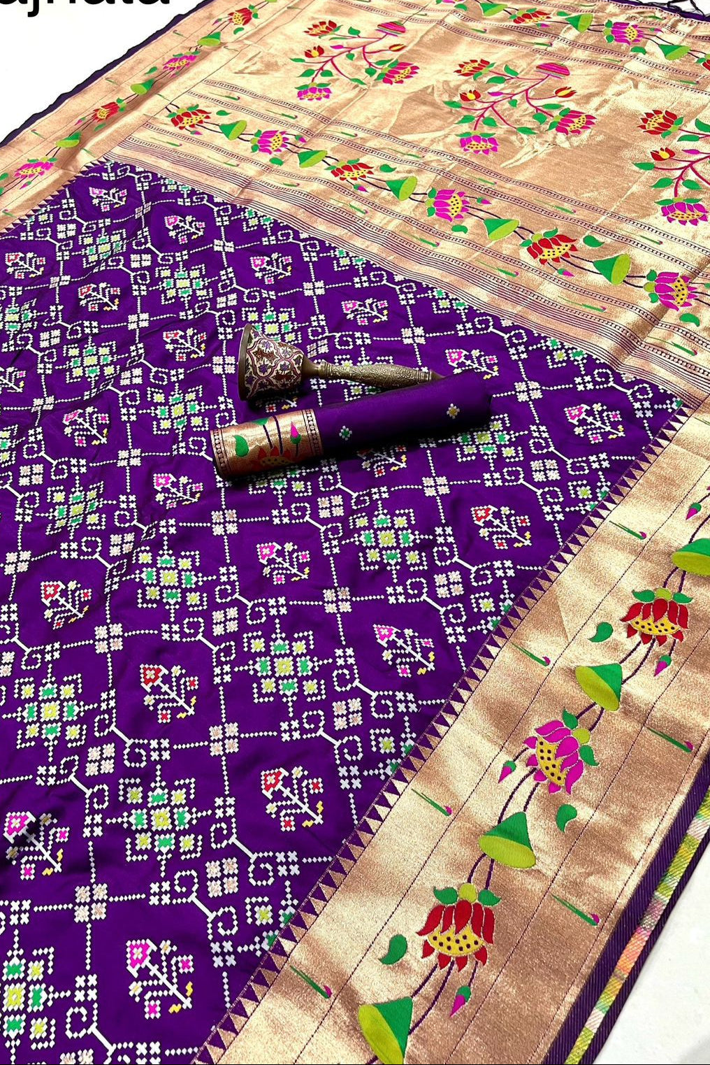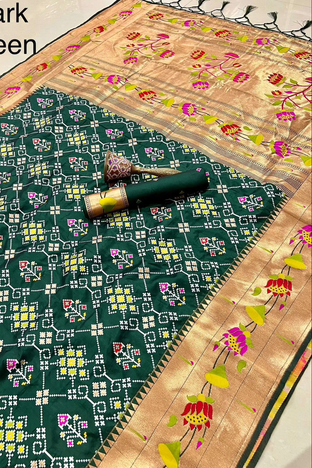 Patolas are a regal collection of Silk sarees made in Patan, Gujarat. The shiny cloth that is painstakingly woven with accuracy and considered an art form. This majestic weave, draped by royals and aristocracy from a bygone age, is a double ikkat in which the warps and wefts are both colored into an intricate design using the warp & weft process while the craftsmen toil for more than 5 to 6 months. They are valued as a wardrobe gem due to their wide range of exquisite designs and color palettes. One of the most notable aspects of this saree is that it has the same appearance and feel on both sides. Patola sarees are classified into three types: Rajkot Patola, Banarasi Patola Silk Saree and Patan Patola.