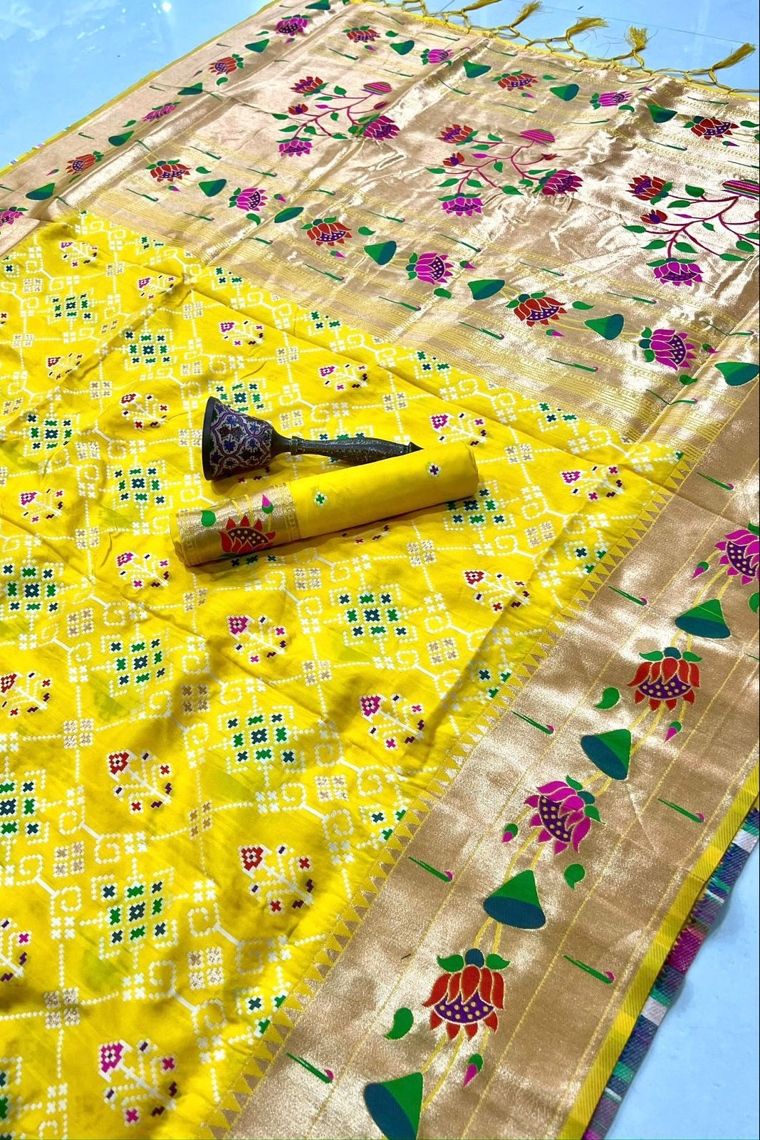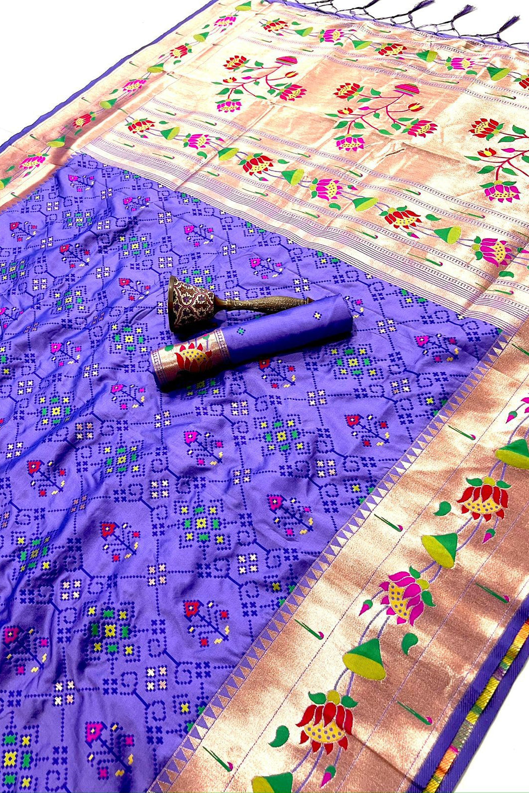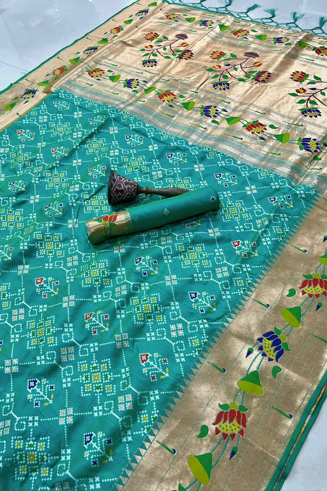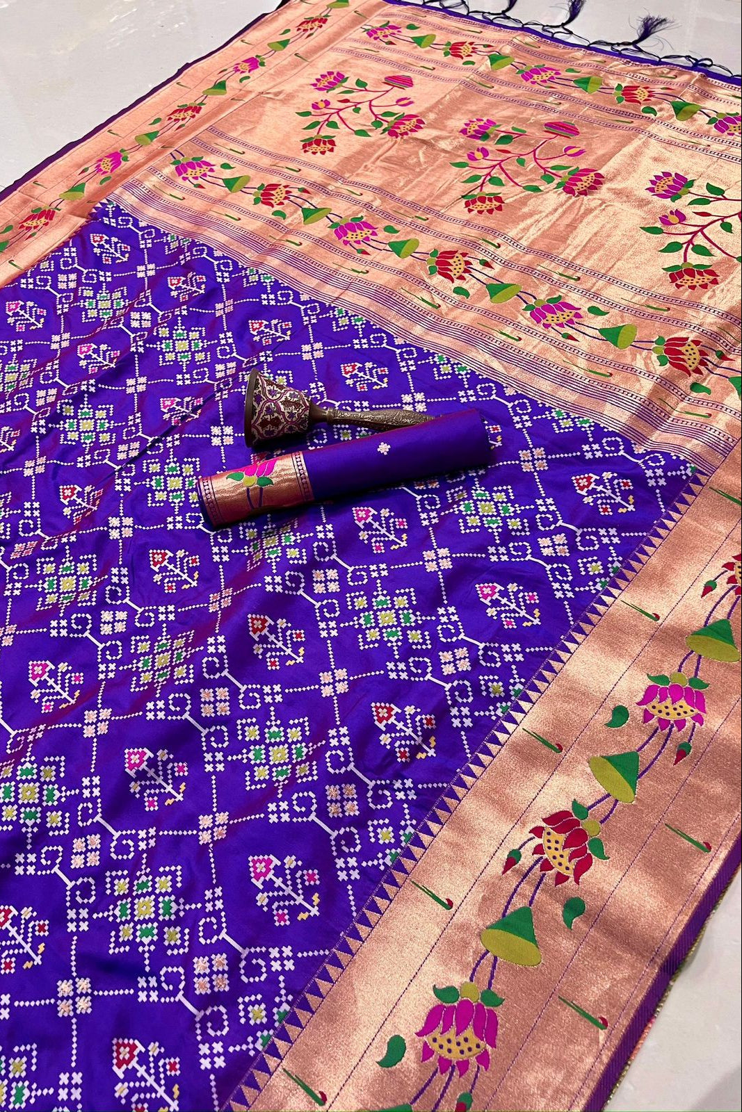 Patolas are a regal collection of Silk sarees made in Patan, Gujarat. The shiny cloth that is painstakingly woven with accuracy and considered an art form. This majestic weave, draped by royals and aristocracy from a bygone age, is a double ikkat in which the warps and wefts are both colored into an intricate design using the warp & weft process while the craftsmen toil for more than 5 to 6 months. They are valued as a wardrobe gem due to their wide range of exquisite designs and color palettes. One of the most notable aspects of this saree is that it has the same appearance and feel on both sides. Patola sarees are classified into three types: Rajkot Patola, Banarasi Patola Silk Saree and Patan Patola.