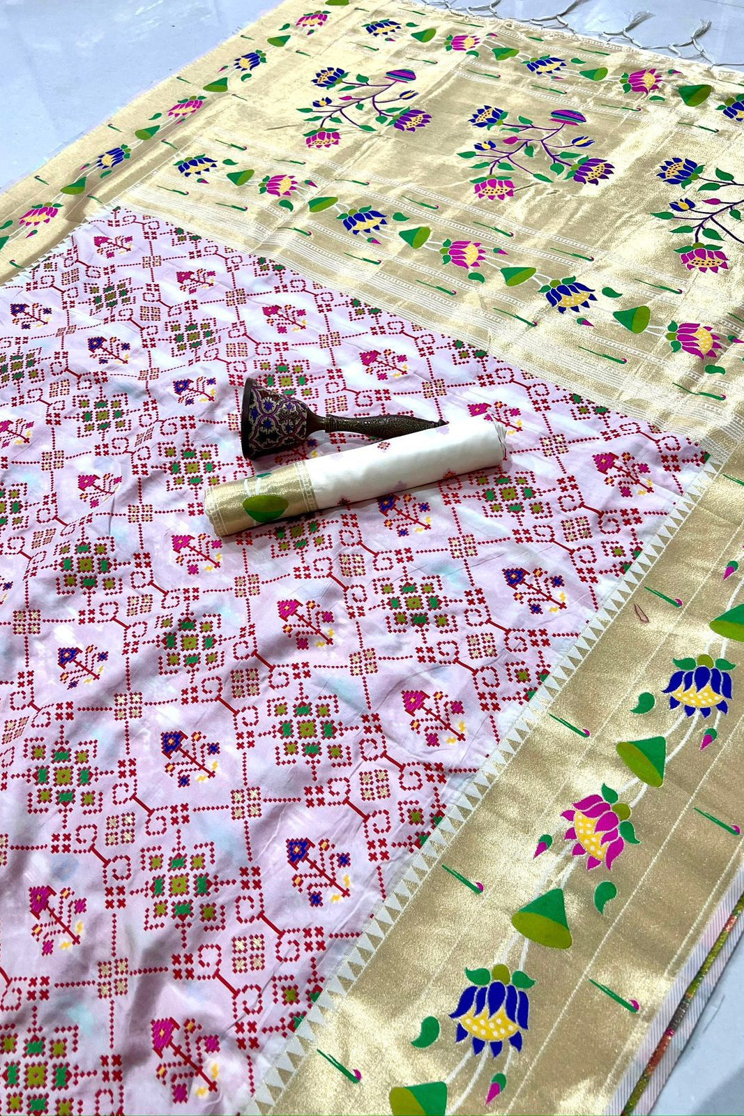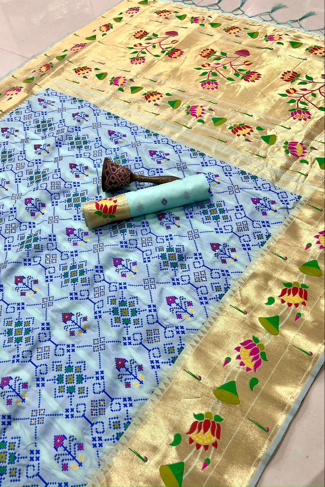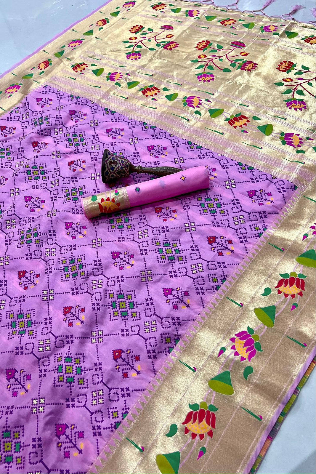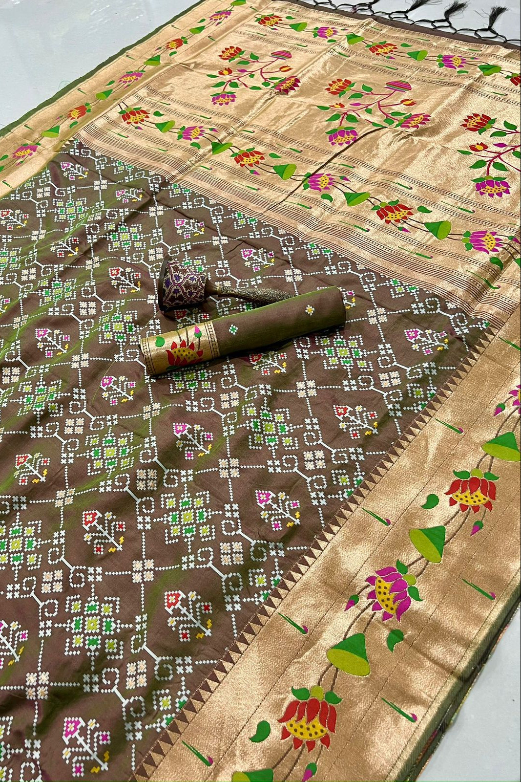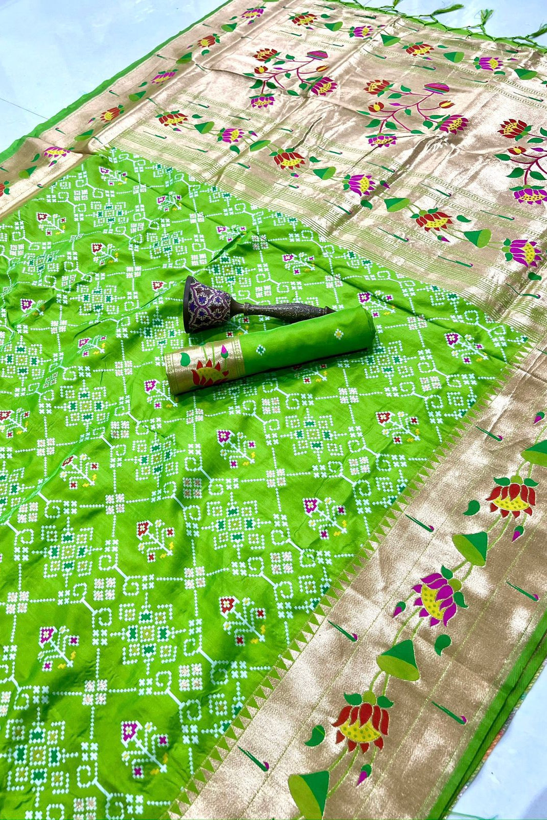 Patolas are a regal collection of Silk sarees made in Patan, Gujarat. The shiny cloth that is painstakingly woven with accuracy and considered an art form. This majestic weave, draped by royals and aristocracy from a bygone age, is a double ikkat in which the warps and wefts are both colored into an intricate design using the warp & weft process while the craftsmen toil for more than 5 to 6 months. They are valued as a wardrobe gem due to their wide range of exquisite designs and color palettes. One of the most notable aspects of this saree is that it has the same appearance and feel on both sides. Patola sarees are classified into three types: Rajkot Patola, Banarasi Patola Silk Saree and Patan Patola.