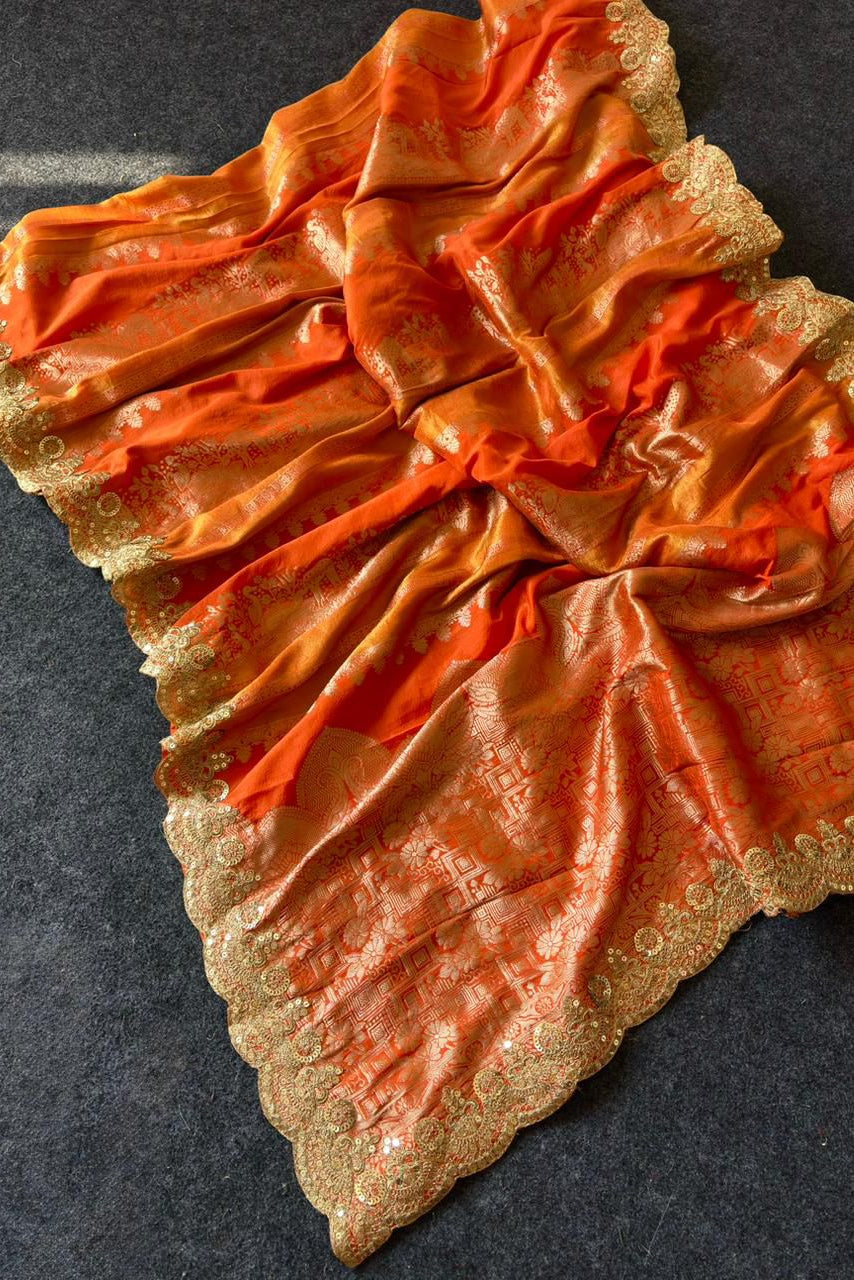 This exquisite khaddi crepe Tissue paithani silk aree showcases tissue paithani silk [ blended]  material and intricate with  golden zari work in combination with peacock design weaving. The luxurious and refined weaving extends to the pallu, featuring  adorable design.  Elevate your fashion game with this premium and classic saree.