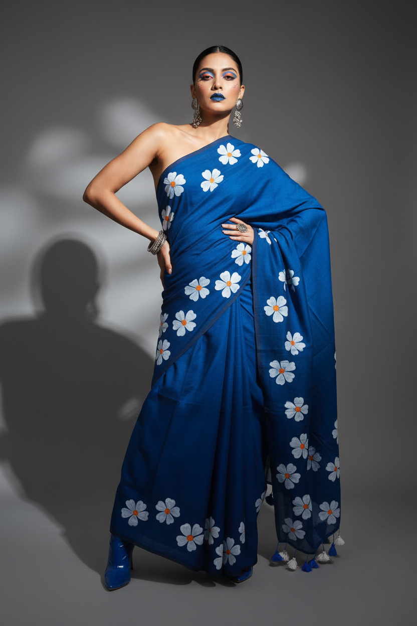 Step into summer with our Mul Cotton Saree ! Made with soft mul Cotton fabric, this saree features All over flower print work .Perfect for a playful and fun look, make a statement with this quirky saree.