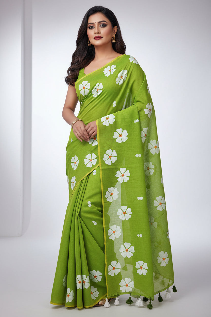 Step into summer with our Mul Cotton Saree ! Made with soft mul Cotton fabric, this saree features All over flower print work .Perfect for a playful and fun look, make a statement with this quirky saree.