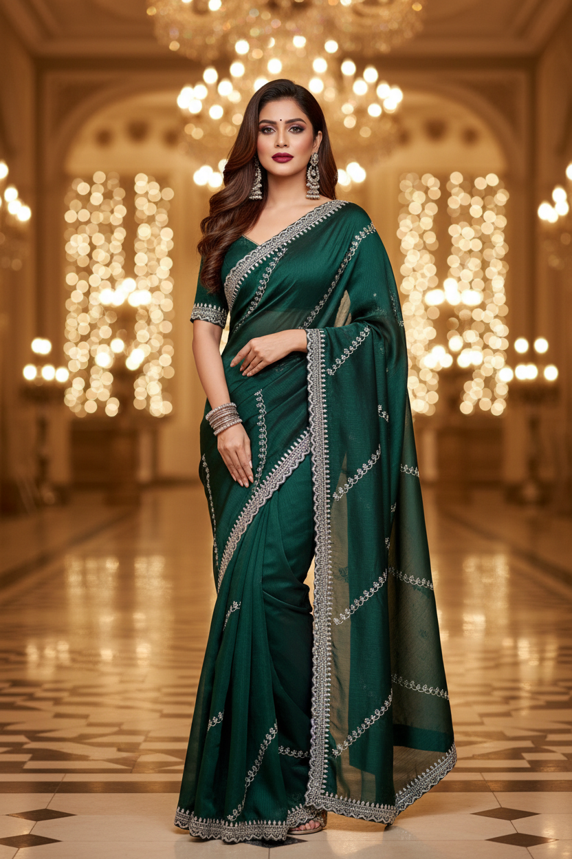 Discover the excitement of our Passion With Fancy Silk Saree. The delicate Soft silk material is embellished with designer patterns along with silver zari embroidery work elevating its elegance. The border features meticulous attention to detail and a distinct charm all its own. For those who want to look daring bold as well as traditional , this saree is perfect!
