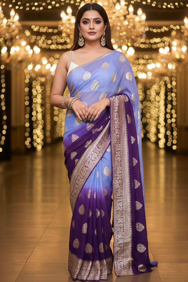 special feature- The saree is made of special Viscose Georgette with weaving Motifs and has Matching Designer Blouse. Beautiful Contrast Embroidered blouse piece makes it unique. The Saree comes with 5.50 metre length.