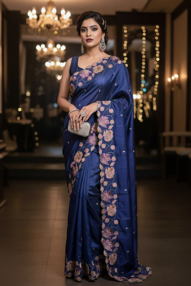 Introducing the Tussar Silk Saree, crafted from premium fabric with intricate contrast Embroidery and Cutwork border. Elevate your style with this luxurious piece featuring beautiful motifs and a beautiful blouse Piece. Experience the ultimate sophistication in every wear.