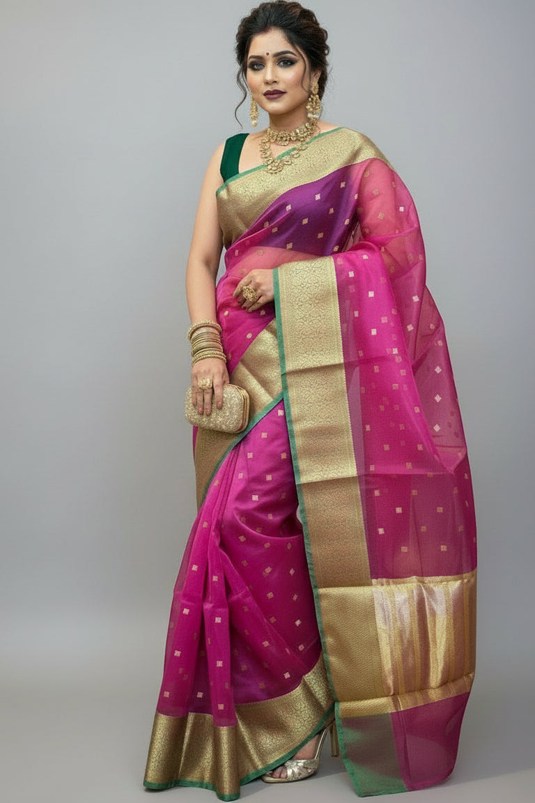 Experience the luxe of Banarasi craftsmanship with this Banarasi Organza Saree, featuring an all-over Big Buti pattern and Zari work border. The Rich Pallu and matching running blouse piece complete the look. Ideal for special wedding wear.