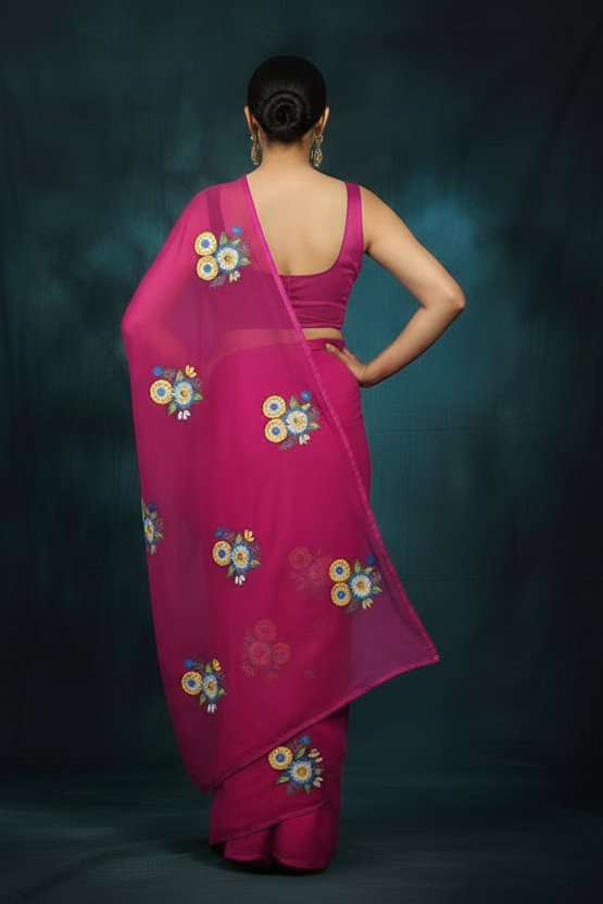 The displayed model image is AI-generated to demonstrate the saree’s drape and elegance. Actual product color and details may vary slightly. Please review the original product images for precise representation.