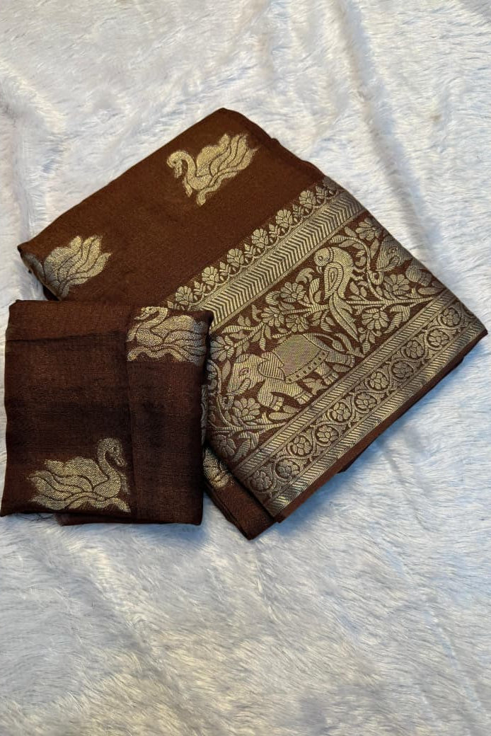 Enhance your elegance with this stunning Viscose jute Khadi [ semi] Saree, meticulously crafted to perfection. The saree features intricate jacquard weaving throughout, adding a touch of opulence and traditional charm. The patta border complements the rich, flowing texture of the viscose jute Khadi fabric, creating a graceful drape that moves beautifully with every step.