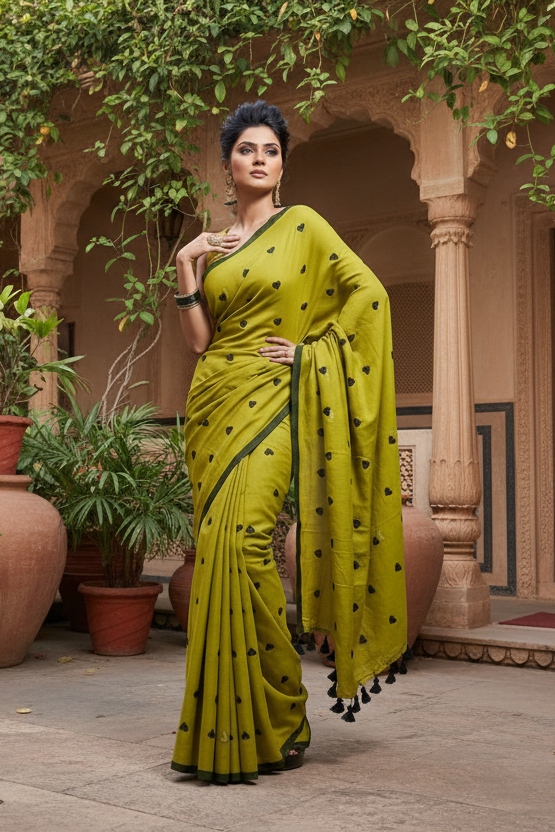 Step into summer with our Love Embroidery Mul Cotton Saree ! Made with soft mul Cotton fabric, this colorful saree features love embroidery design with tassels work. Perfect for a playful and fun look, make a statement with this quirky saree.