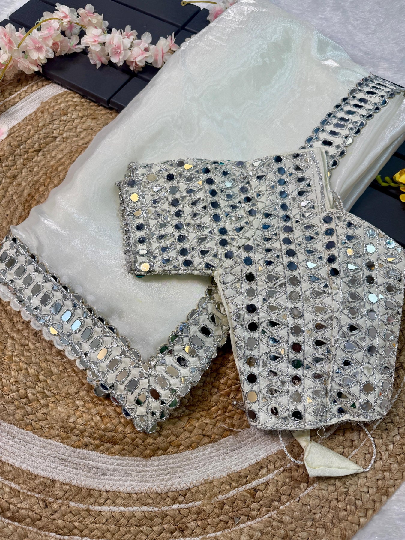 This exquisite Serene Breeze Satin Organza Silk Saree showcases Satin Organza silk [blended] material and intricate mirror work with Embroidery work , highlighted by stunning design. The luxurious and refined designs extends to the body. The saree is complemented with traditional designs. Elevate your fashion game with this premium and classic saree.