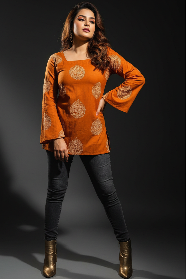 Add a touch of elegance to your everyday wardrobe with this stylish pure cotton short kurti. Crafted from breathable and soft cotton fabric, it ensures all-day comfort. Designed with a flattering straight fit, this kurti is perfect for casual outings, office wear, or daily use. Pair it with jeans, leggings, or trousers for a chic and effortless look.