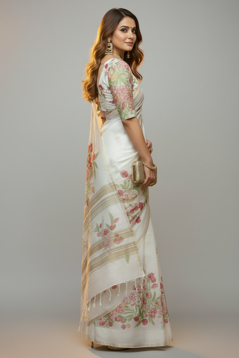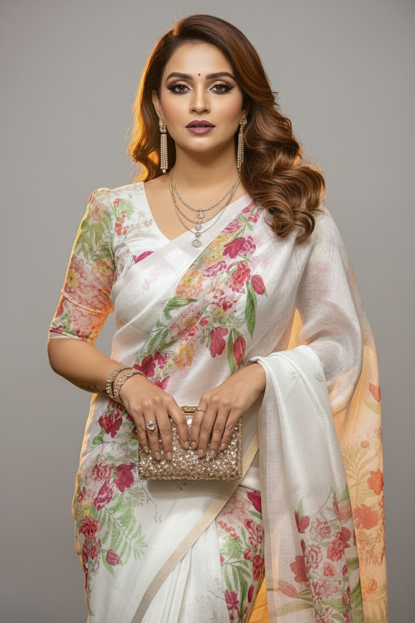 Add a touch of luxury to your wardrobe with this exquisite Meadow Rose Fancy Chanderi Saree. Meticulously crafted from Chanderi fabric and featuring a digitally printed floral motif, this saree is sure to make a statement with its opulent mix of colors. Make your next special occasion a memorable one with this exclusive creation.